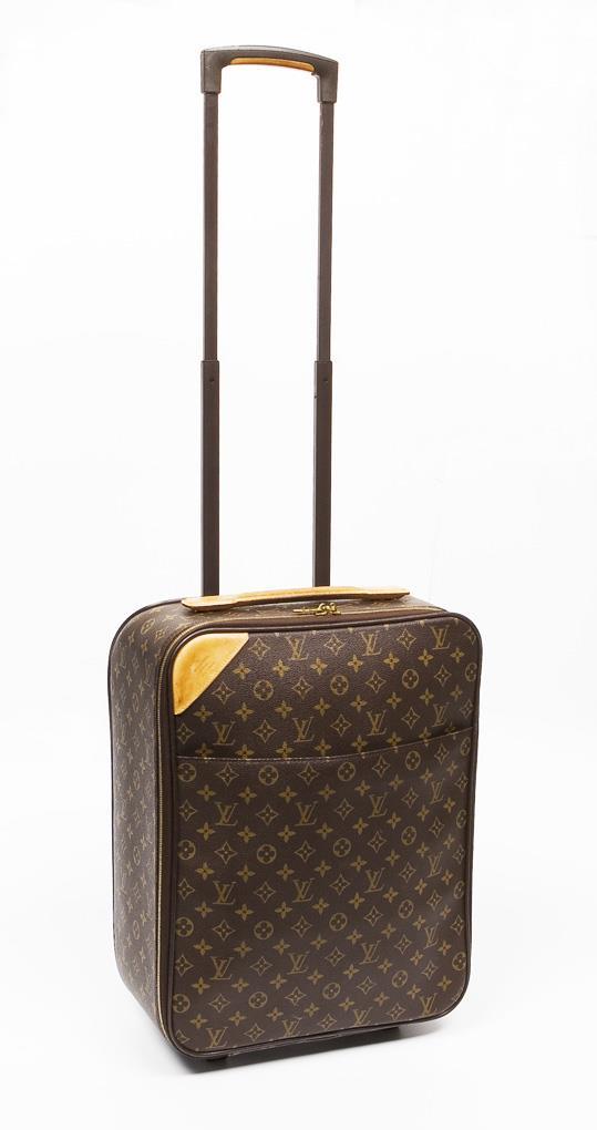 Paris, Made in France. Model Pégase 50, model no. M 23251. Classic LV monogram canvas, frontal leather trim, main compartment with wraparound two-way zipper, exterior open front pocket, leather carry handle, telescopic handle, rubber wheels. Textile lining, inside two zippered compartments, one velcro pocket. Inside and outside leather label: Louis Vuitton, Paris, Made in France. Hand luggage size. Rolls with traces of use, otherwise good condition.