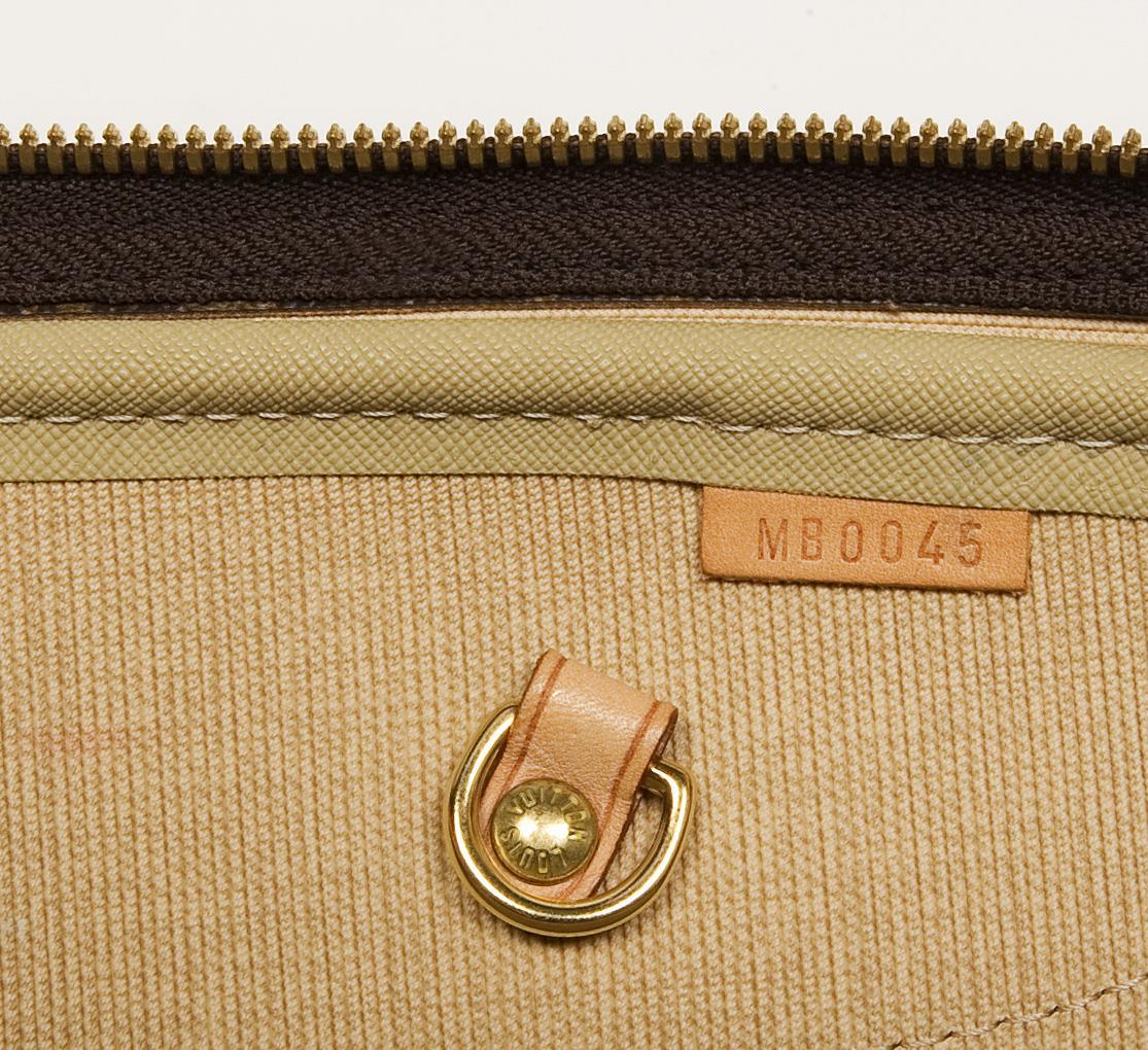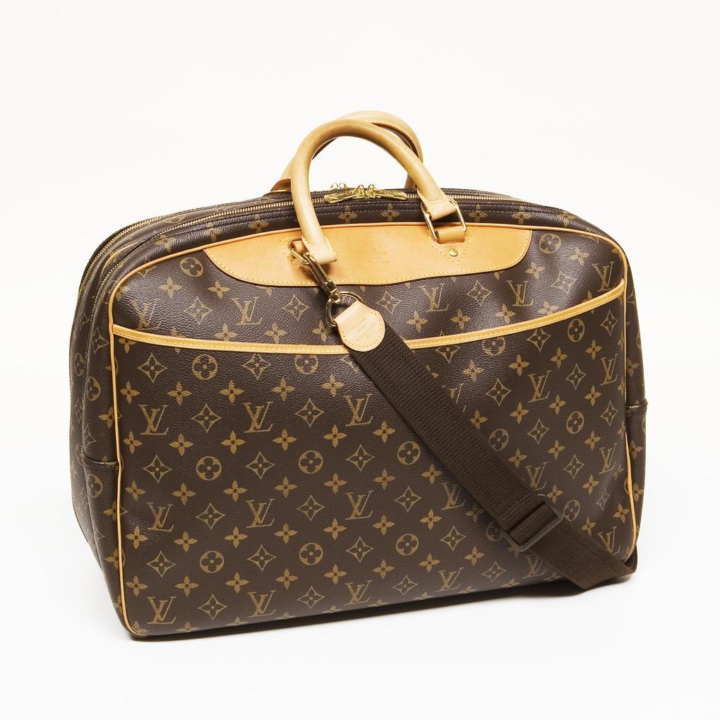 Paris, Made in France, model Alizé 24 Heures NM, model no. M 41399. Inside embossed leather date code: MB 0045 (made in France in the 4th calendar week of 2005). Classic LV monogram canvas, leather trim. Two main compartments with two-way zipper closure, exterior one large slip pocket, leather carry handles. Detachable, adjustable textile shoulder strap with leather trim. Washable bright lining, one large slip pocket in each bag section. Leather embossing: Louis Vuitton, Paris, Made in France. Hand luggage size, to be carried in hand, over the shoulder or diagonally on the body. Little worn, good condition.