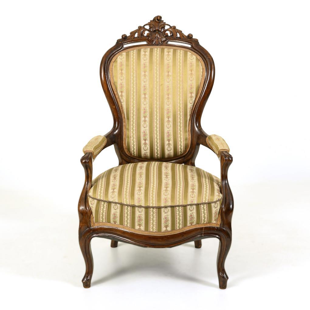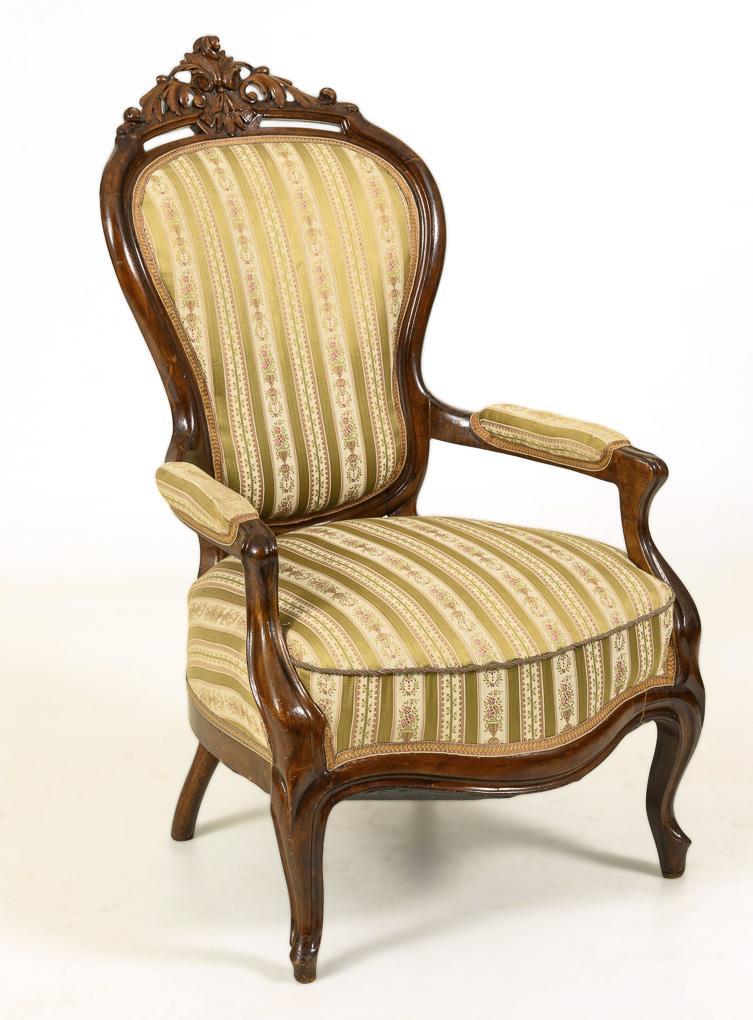 Upholstered, style-typical curved armchair with crowning acanthus leaf carving, cream and gold striped cover with floral repeat. Traces of age/use, upholstery and cover supplemented.