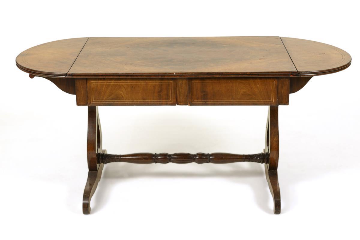 Elegant coffee table in English style, on 2 lateral lyre supports with foot bracing and semicircular side cheeks, decorated with mirrored burl veneer and thread inlays, 2 hidden frame drawers. Old restored, few signs of age/use.