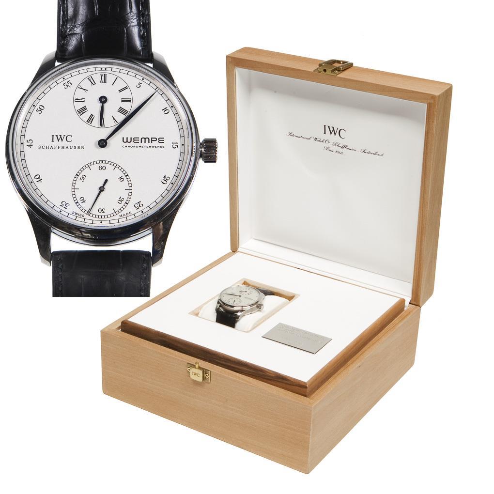 Limited, numbered: 22/100, special edition 100 years of Wempe chronometer movements. Hand-wound, movement finely finished, caliber 98240, power duration 46 hours, 22 jewels. Water resistant to 30 meters. Sapphire crystal, blued steel hands, silver dial, small seconds, central minute indication, sub-dial for 12-hour indication, screw-down glass case back. Original crocodile leather strap with pin buckle. Instruction manual, warranty service booklet, warranty card, certificate, original box, carton. Functioning in short-term test. Cushion coating in the box defective.