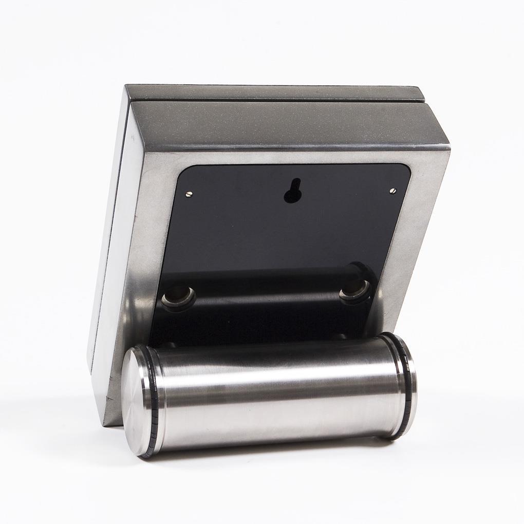Battery-powered precision radio-controlled clock movement. Wooden body with screwed steel coating, screwed dial for hours and minutes, hanging secondary dial on three columns. Heavy stainless steel cylinder can be used as a stand in two inclination levels, also suitable for hanging as a wall clock. Instruction manual with certificate, original box. Case with small dents, movement intact, seconds display defective.