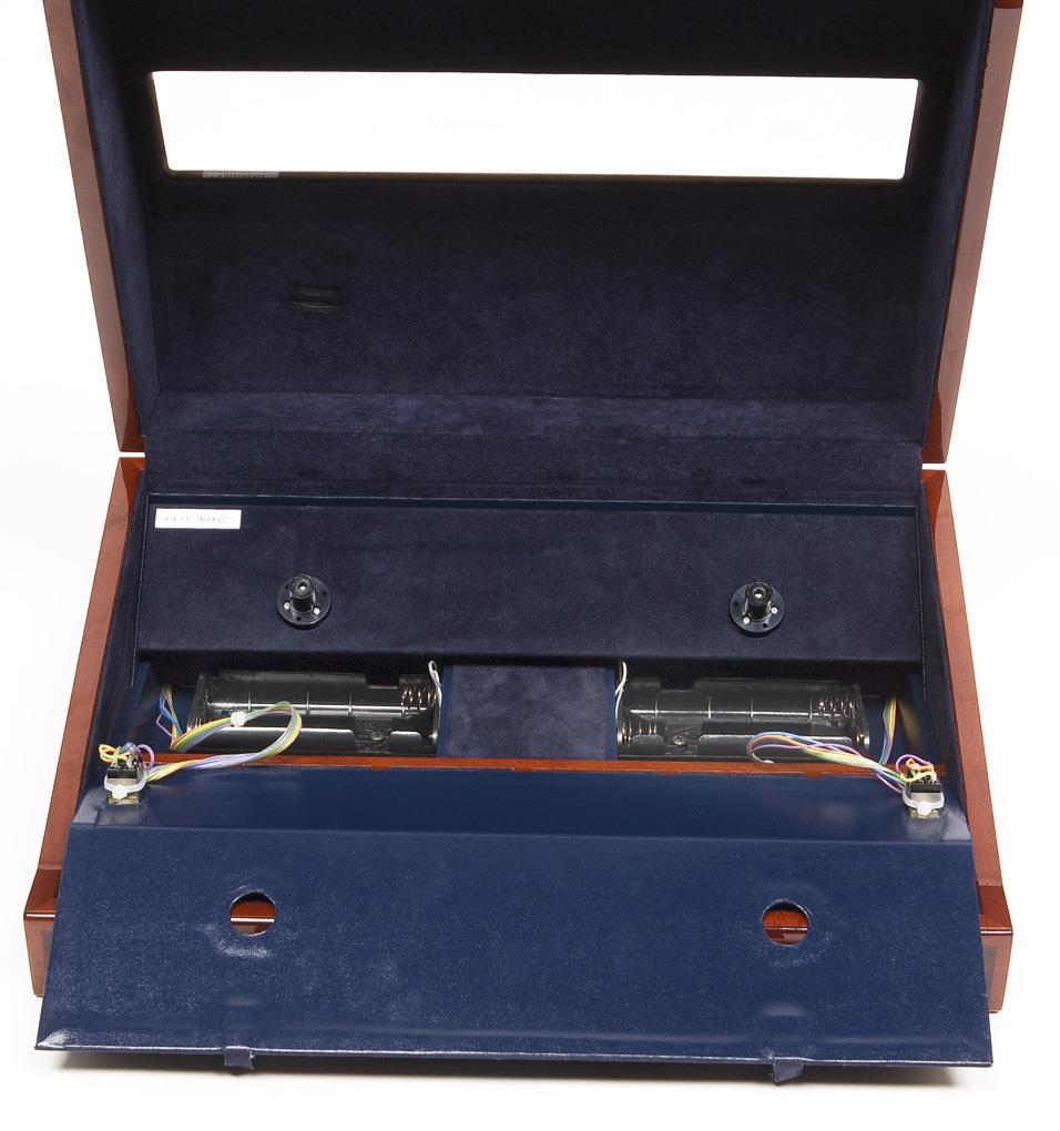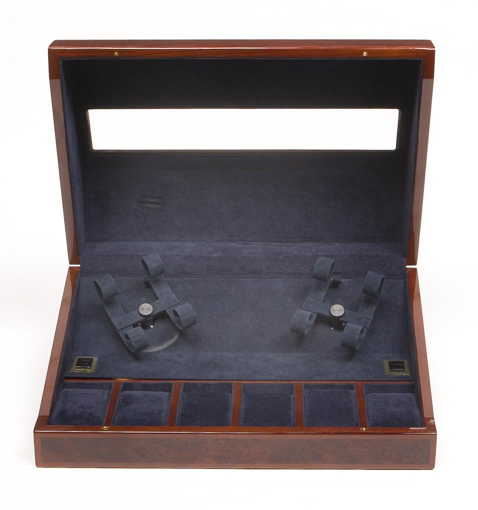 Executive by Buben & Zörweg. Serial no. EX0112BZ842. Movers for 4 clocks, box for 6 clocks, 2 switches for cycle operation and continuous operation. Lacquered wooden body with viewing window, black velvet inside. Battery operated, without mains adapter, with manual, in original box.