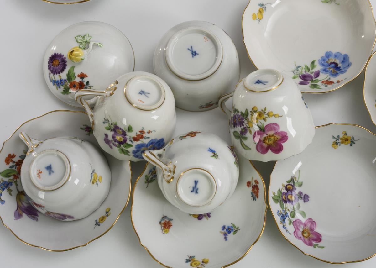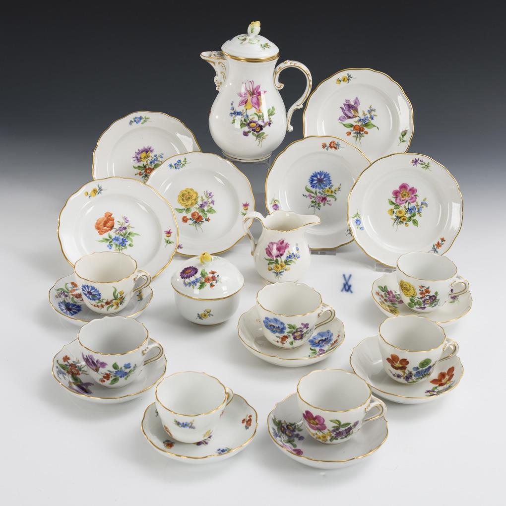23 parts. "New cut-out" shape. Demitasse pot (h 16.5 cm), milk jug, sugar bowl, 7 demitasse cups, 7 saucers and 6 pastry plates. Bump to the sugar bowl knob.