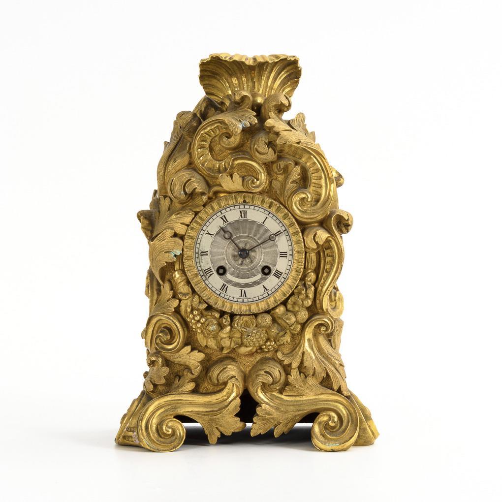 Bronze clock with rocaillé and partially plastic floral decorated case. Light signs of age, supplemented improvised movement cover.