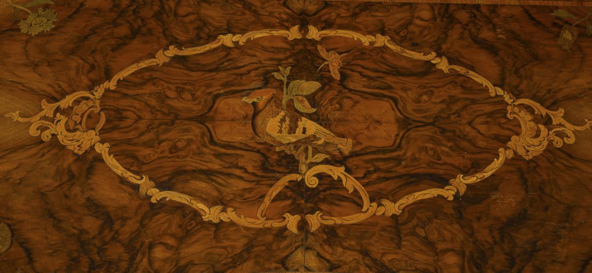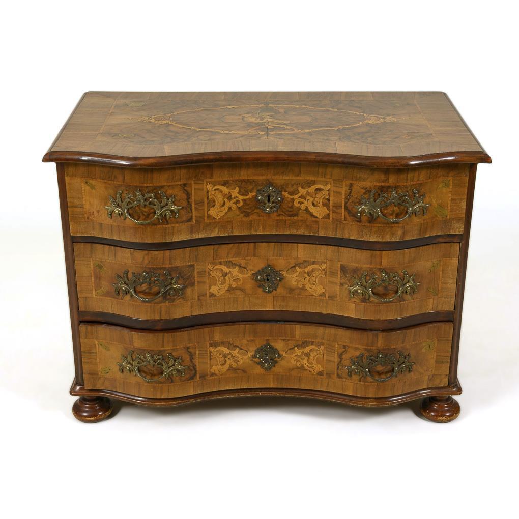 3-shouldered, style-typical curved chest of drawers on planked ball feet, finely decorated with coffered burl veneer, top plate with delicate bird marquetry, flowers and rocaille band, Schübe with rocaille marquetry; decorated with üppigen bronze fittings. Alt restored with ergänzungen.