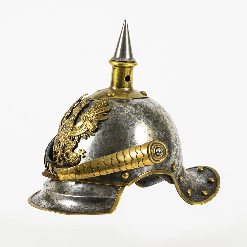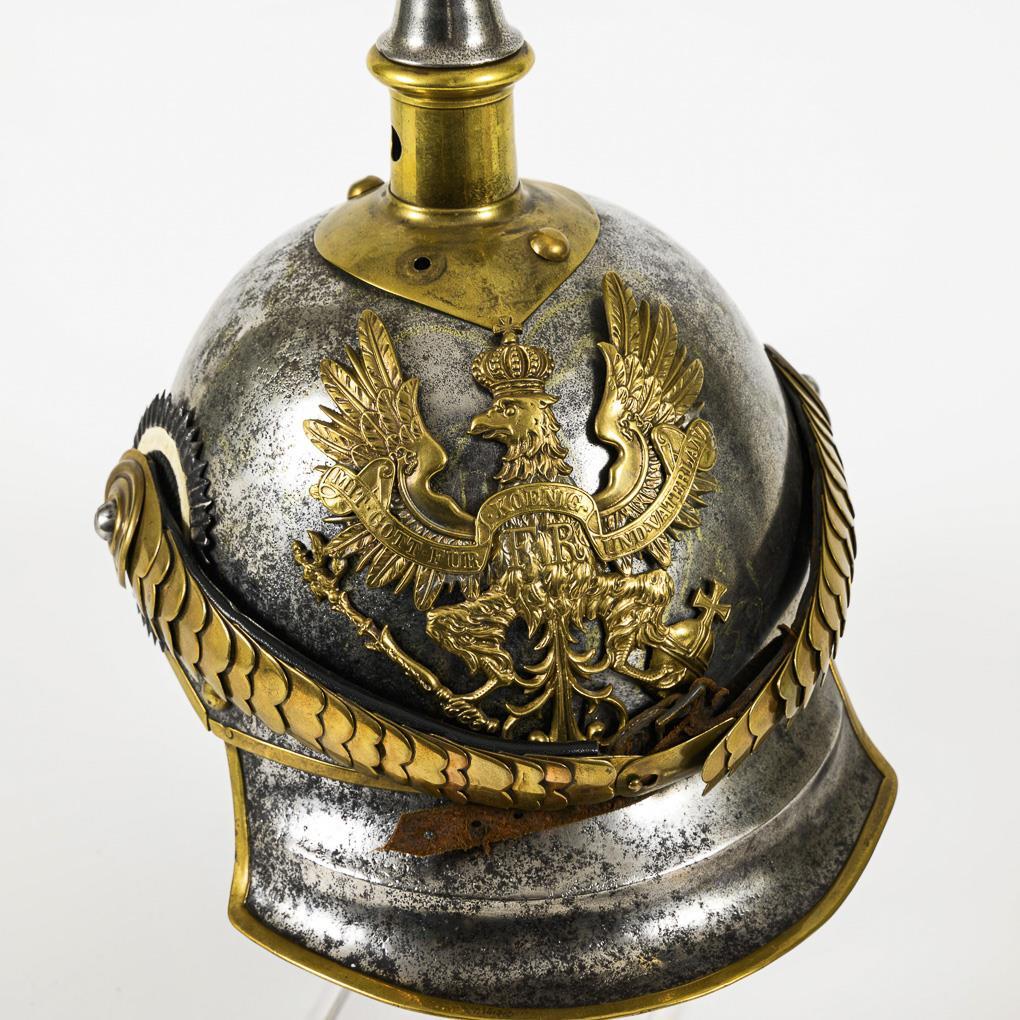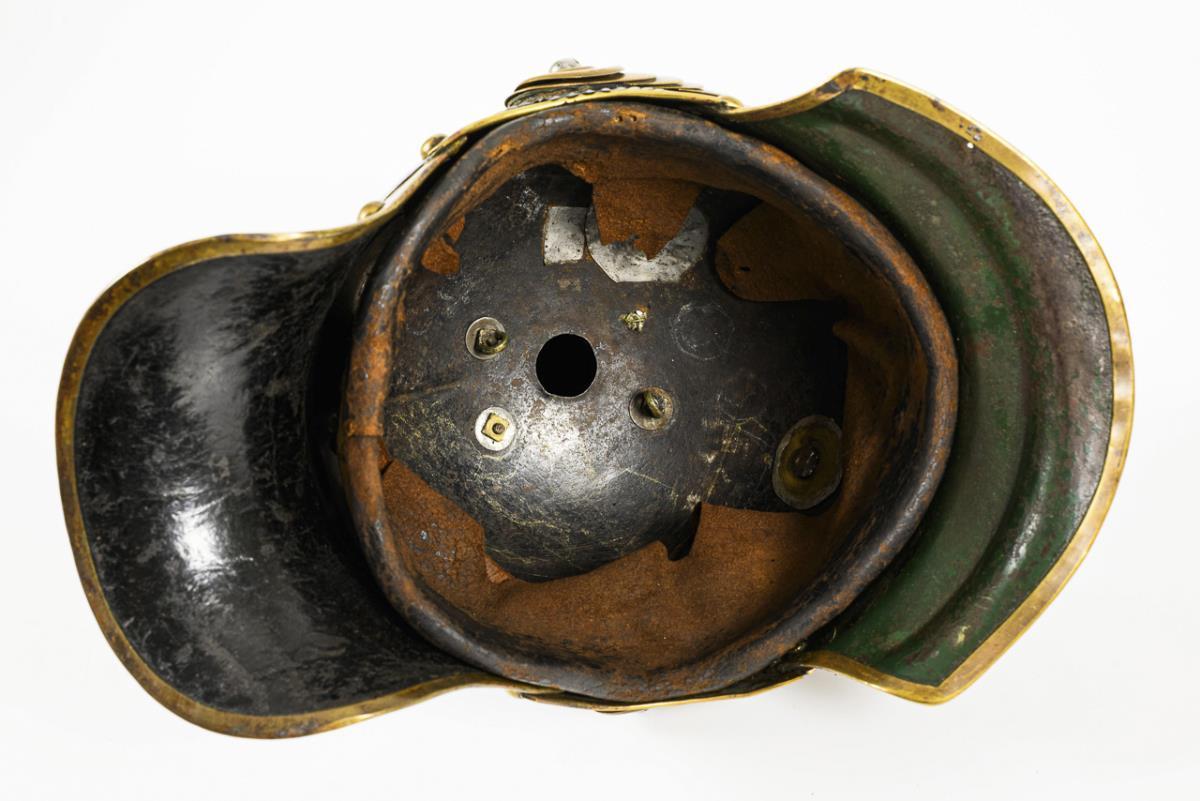 Model 1867 of the line cuirassier regiments 3, 4, 5, 7 and 8. Iron with large brass application of the Prussian coat of arms, scale chain and Prussian cockade. Carved design on the inside, old leather lining, some screws probably replaced and places with metal patches. Front peak painted green, neck peak with black leather. Corrosion scars, heavy signs of age, one rivet missing at the tip, imperial cockade missing.