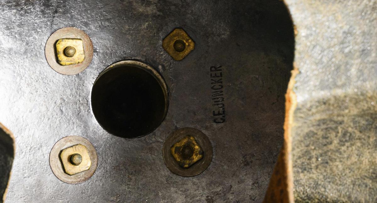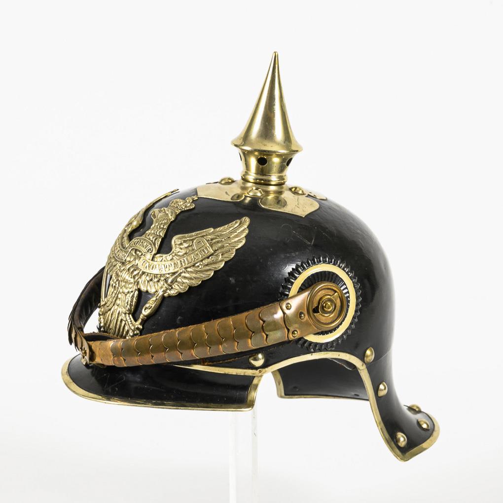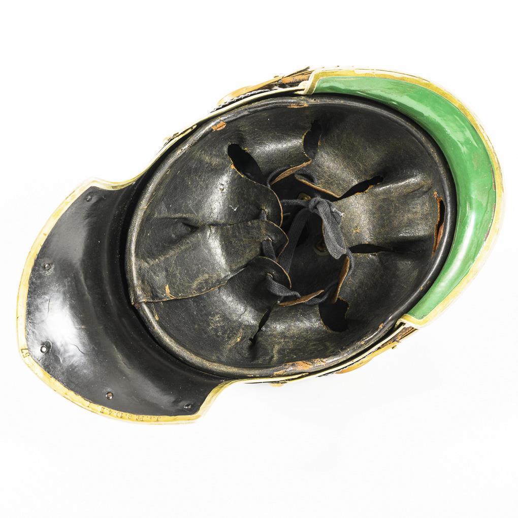 Black lacquered iron helmet with Prussian and Imperial cockade. Brass chinscales and silver-colored peak. Name "C.E. Juncker" stamped on the inside. Black leather interior, green front peak and black lacquered neck peak. Few scratches in the lacquer.
