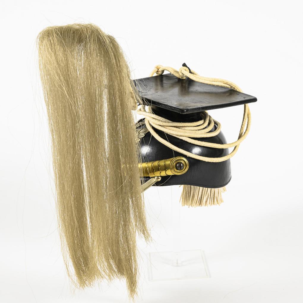 Chapka for non-commissioned officers or one-year volunteers, black lacquered leather body, large silver-colored eagle emblem with 'FR' (line eagle), gold-colored scale chain. Black and white field insignia, white catch cord and white helmet crest, for parade. Leather lining. One corner of the upper plate with crease marks, but is firm. Front shield with wavy leather cover.