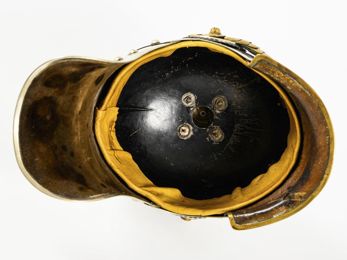 Silver-coloured, polished iron bell, as well as eagle emblem, finial and fluted tip. Scale chain with crosses on trefoils at the ends and front shield edging gold-coloured. Imperial and Prussian cockade. Black lacquered interior, younger-looking leather sweatband, front peak with older, light leather trim, neck peak covered with stained brown velvet.