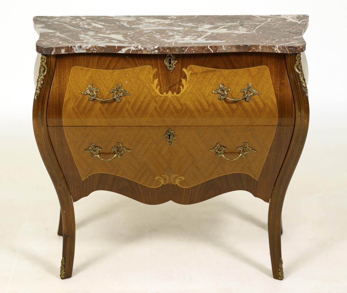 2-bay, style-typical curved chest of drawers with marble top, decorated with lush bronze applications and parquetry front and sides. Light signs of age/use.