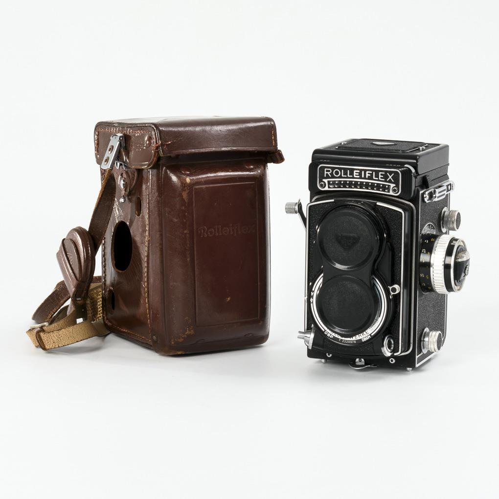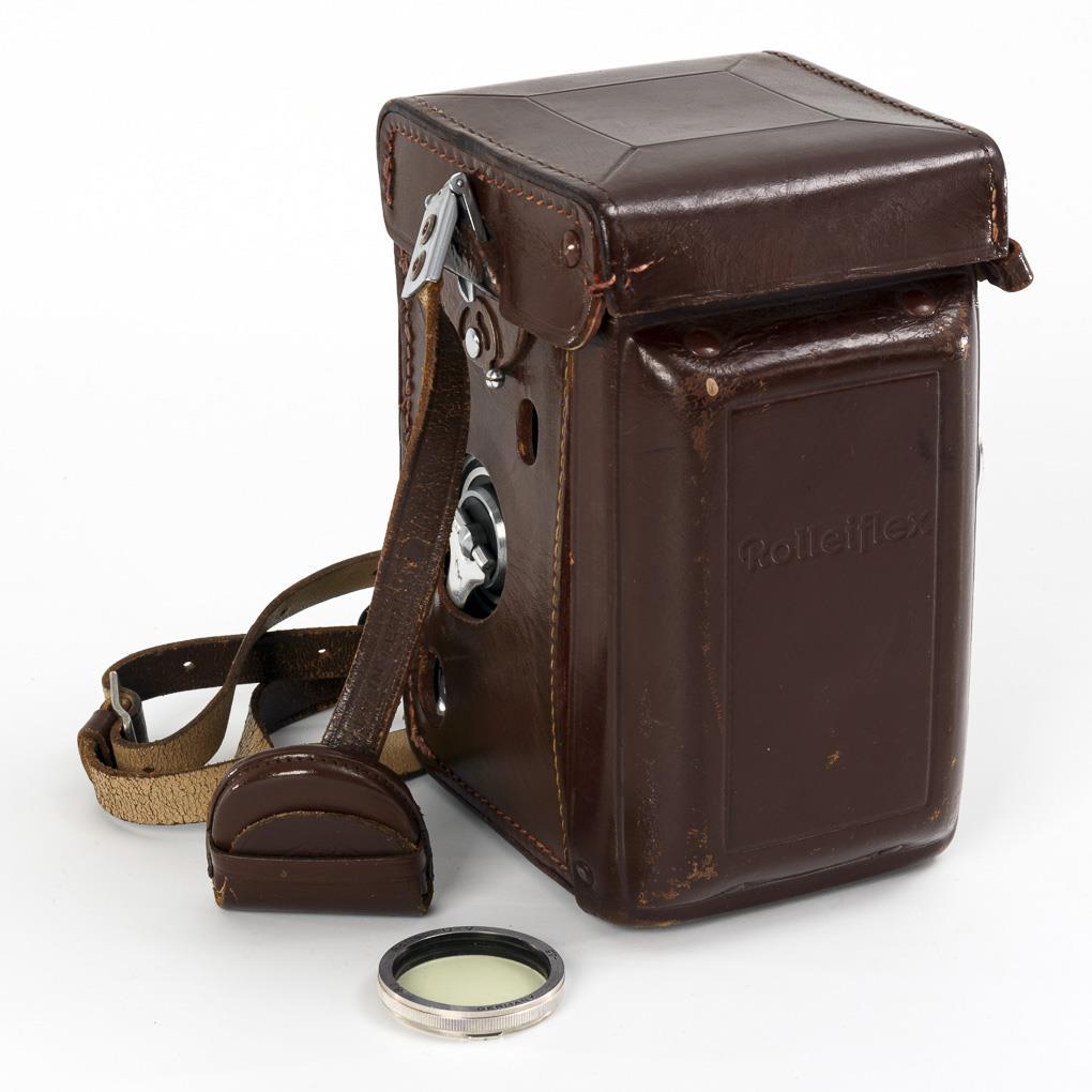 Photographic camera "Rolleiflex Synchro Compur X" in leather case. Franke & Heidecke.
