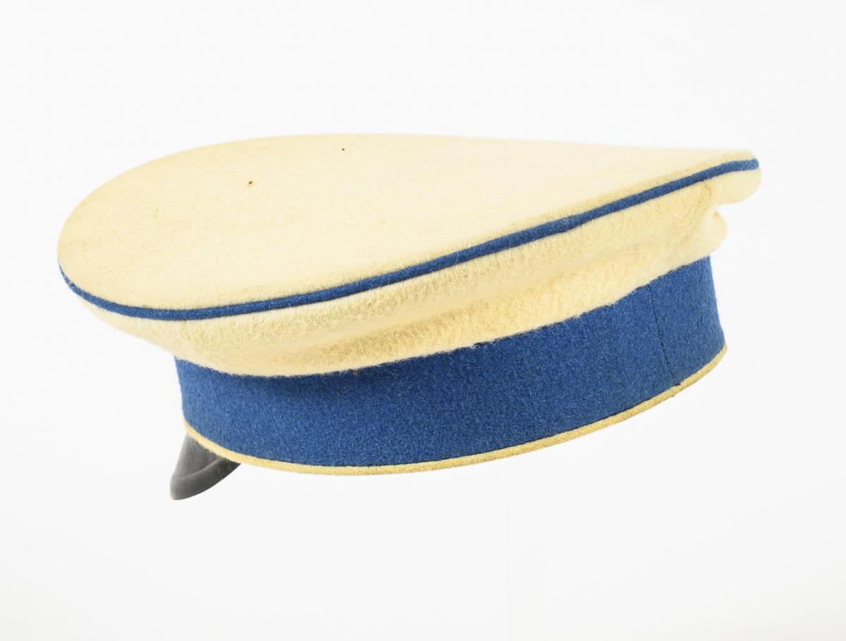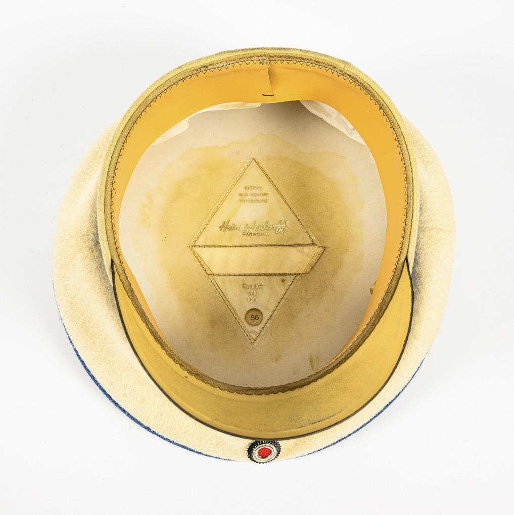 Cream-colored plate, blue ribbon, black visor pressed from cardboard. Inside: Company mark: "Heinrichsdorff, Paderborn", hat size 56. In mint condition.