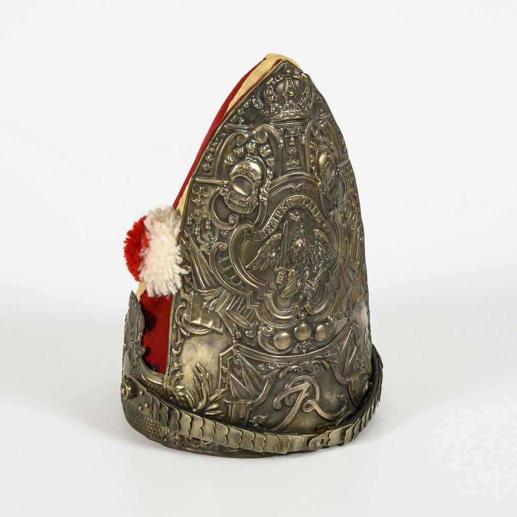 Model 1894. Large embossed metal shield with scale chain. Red cloth with some moth damage, leather sweatband with ownership label "Grenadier Ständer 7. ...G.R. (z.F.?)". Tassel tip probably replaced, blue felt lining under the leather band. If the red fabric was added, then very professional.