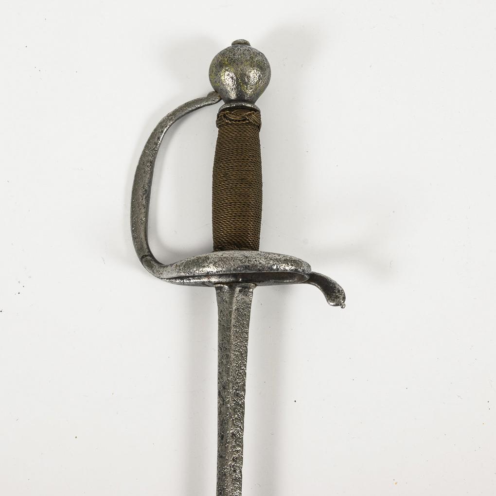 Square blade, single bow and wire winding with braided ends. Corrosion scars.