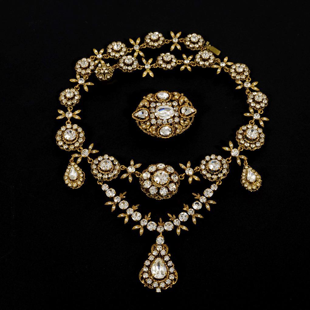 Elaborately crafted, large necklace and brooch with rich rhinestone setting on gold-colored metal mounts. Box lock, ball hook.