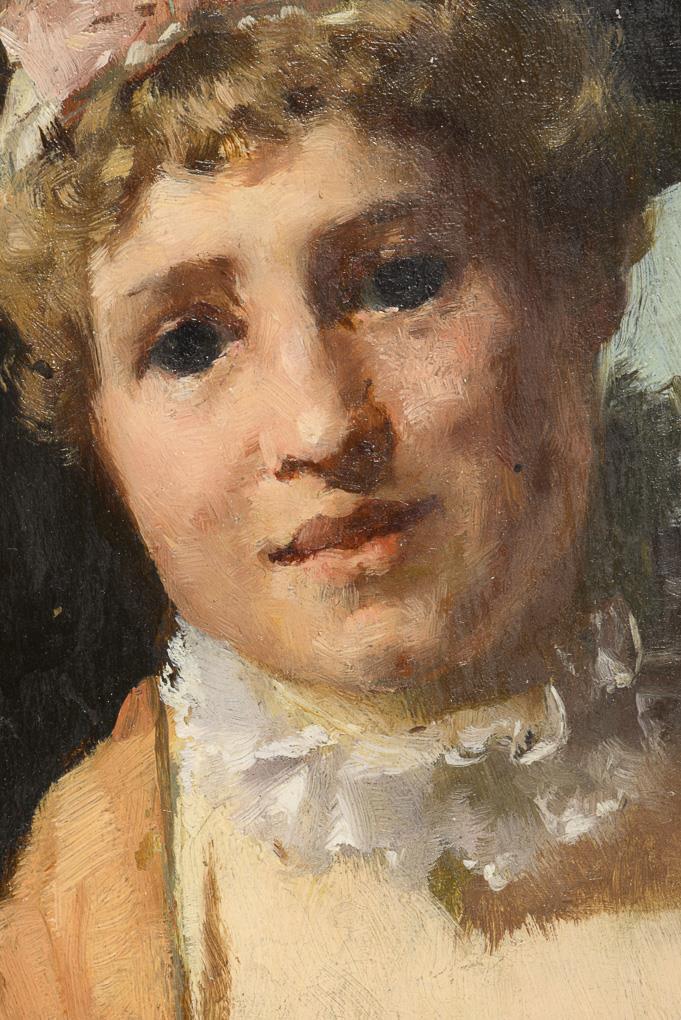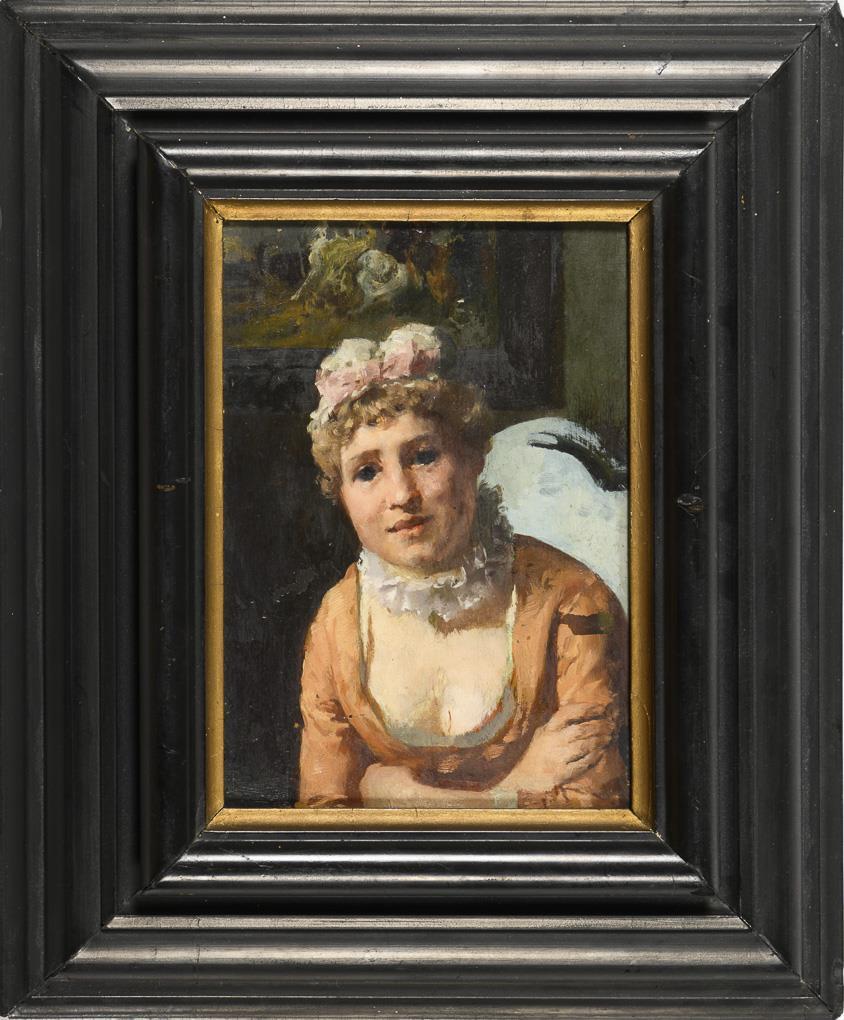 Portrait of a young woman with a bow in her hair in a room in front of a painting. Color chips.