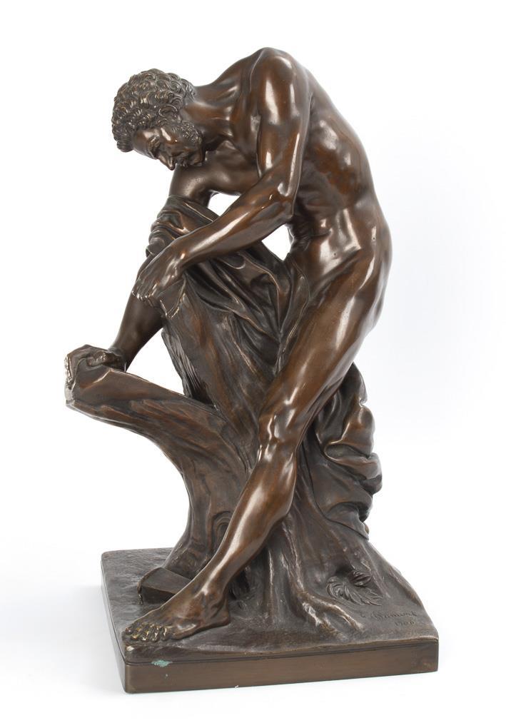 The famous wrestler of antiquity tearing apart a tree stump with his hands. Recent cast after the baroque marble statue of the athlete in the Louvre. Minor patina damage to the base.