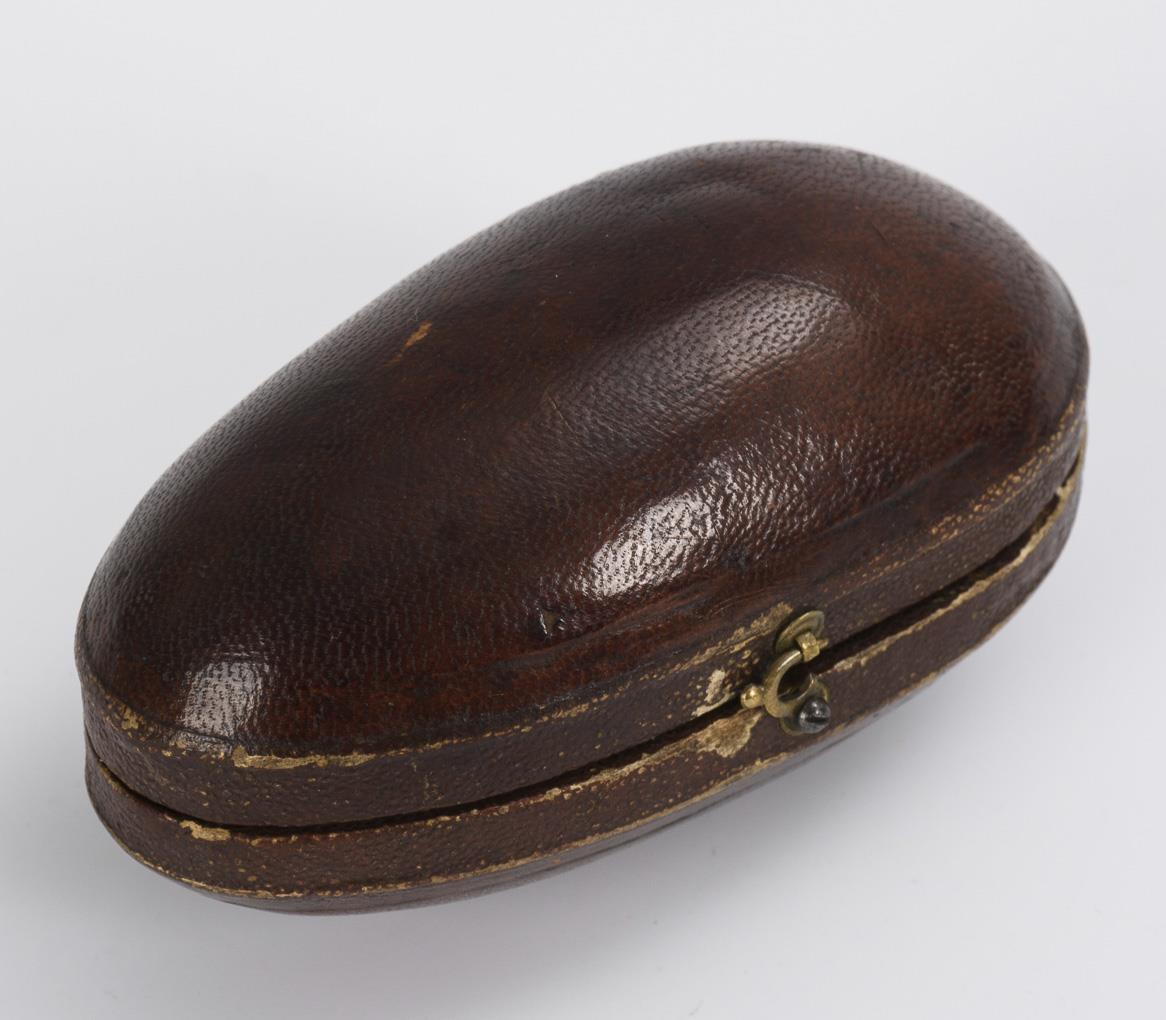 Ovoid glass flacon with hinged lid and finely engraved mounting; inner stopper with bird figure. Bird with hole in the wall, case some signs of age/use.
