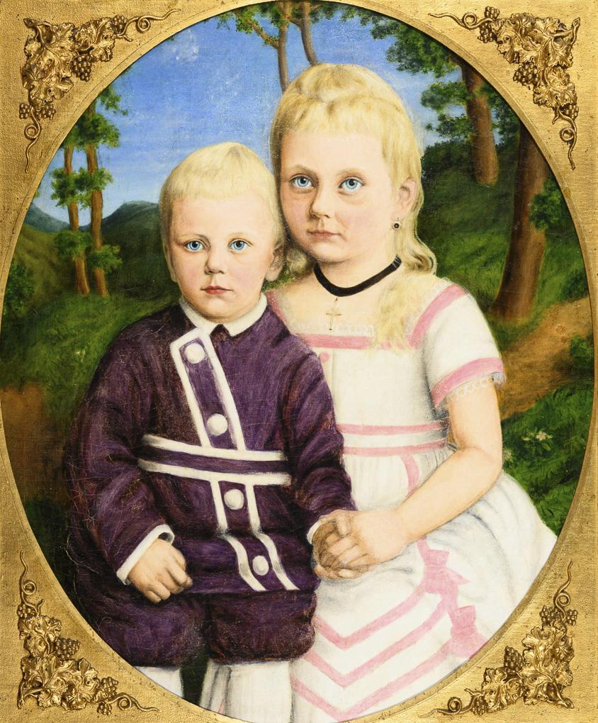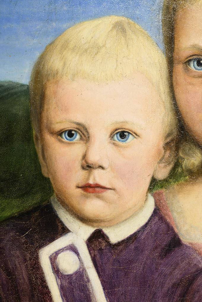The big sister in a white dress with her little brother on her lap in a green landscape. A restored area with backing.