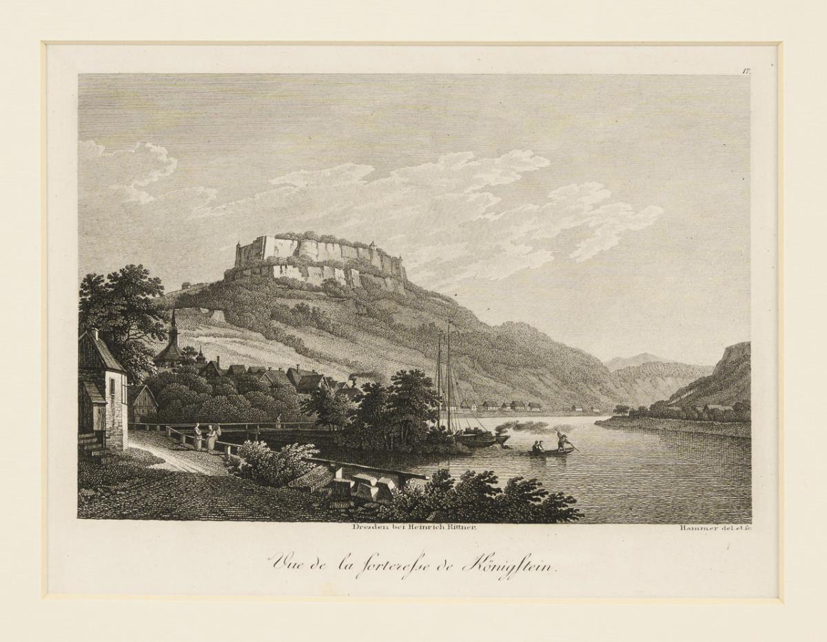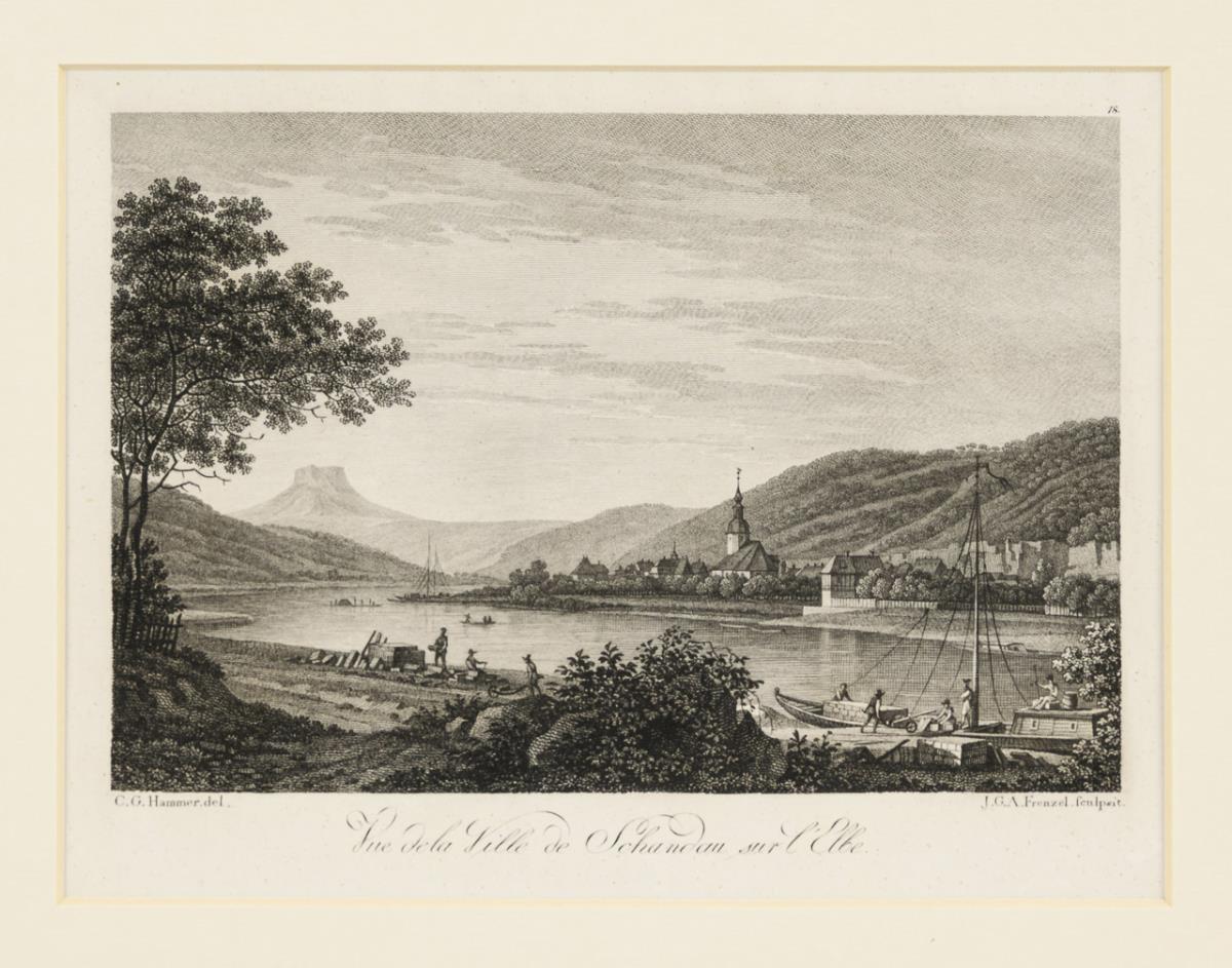Sheet 17: View of Königstein Fortress "Vue de la forteresse Königstein" and sheet 18: View of Bad Schandau "Vue de la Ville de Schandau sur l'Elbe"; from: Gottlob Friedrich Thormeyer's "Dresden with its magnificent buildings and most beautiful surroundings. Dresde avec ses édifices et plus beaux environs", Dresden, ca. 1820, published by Heinrich Rittner, 2nd edition with 26 plates. After drawings by Gottlob Friedrich Thormeyer (1775 Dresden - 1842 Dresden) and Christian Gottlob Hammer (1779 Dresden - 1864 Dresden); engraved by Philipp Veith, Johann Gottlob Schumann, Johann Adolf Darnstedt, Johann Gottfried Abraham Frenzel and Christian Gottlob Hammer. Je minimally foxed.