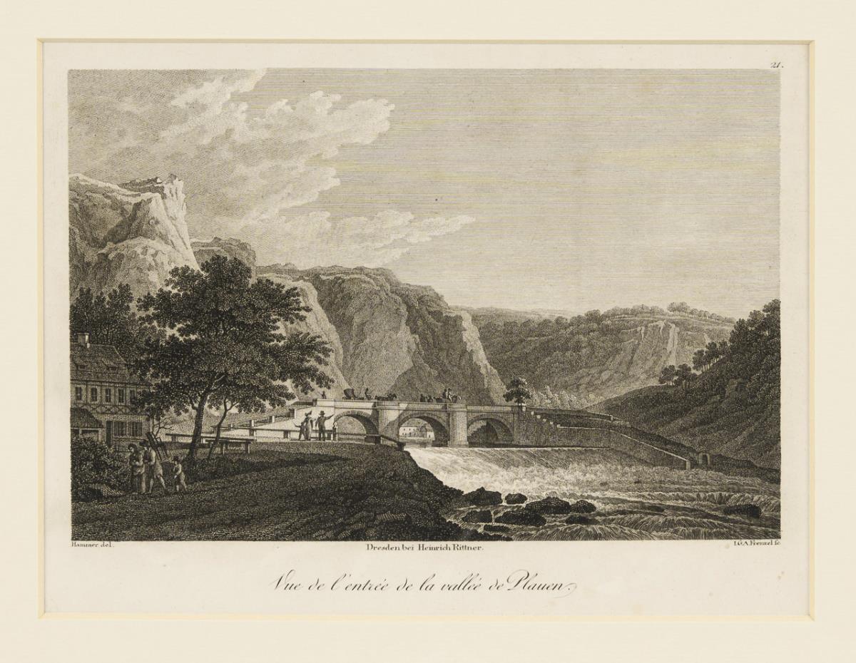 Sheet 21: View of the Hegereiter Bridge and the Plauen Valley "Vue de l'entrée de la valée de Plauen" and sheet 14: View of the Pirna Gate "Vue l'exterieure de la Porte de Pirna"; from: Gottlob Friedrich Thormeyer's "Dresden mit seinen Prachtgebäuden und schönsten Umgebungen. Dresde avec ses édifices et plus beaux environs", Dresden, ca. 1820, published by Heinrich Rittner, 2nd edition with 26 plates. After drawings by Gottlob Friedrich Thormeyer (1775 Dresden - 1842 Dresden) and Christian Gottlob Hammer (1779 Dresden - 1864 Dresden); engraved by Philipp Veith, Johann Gottlob Schumann, Johann Adolf Darnstedt, Johann Gottfried Abraham Frenzel and Christian Gottlob Hammer. Je minimally foxed.