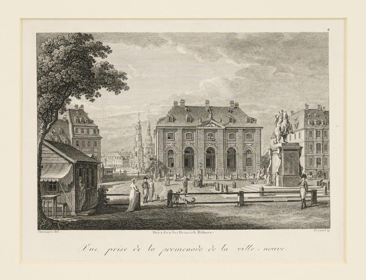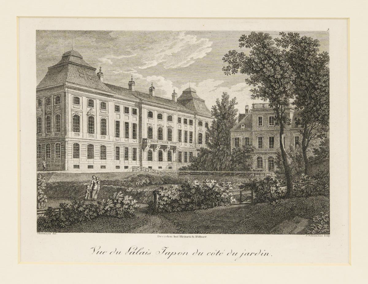 Sheet 3: View of the Japanese Palace from the garden "Vue du Palais Japon du côté du jardin" and sheet 4: View from the avenue of lime trees to the bridge "Vue, prise de la promenade de la ville-neuve"; from: Gottlob Friedrich Thormeyer's "Dresden mit seinen Prachtgebäuden und schönsten Umgebungen. Dresde avec ses édifices et plus beaux environs", Dresden, ca. 1820, published by Heinrich Rittner, 2nd edition with 26 plates. After drawings by Gottlob Friedrich Thormeyer (1775 Dresden - 1842 Dresden) and Christian Gottlob Hammer (1779 Dresden - 1864 Dresden); engraved by Philipp Veith, Johann Gottlob Schumann, Johann Adolf Darnstedt, Johann Gottfried Abraham Frenzel and Christian Gottlob Hammer. Some foxing in margins.