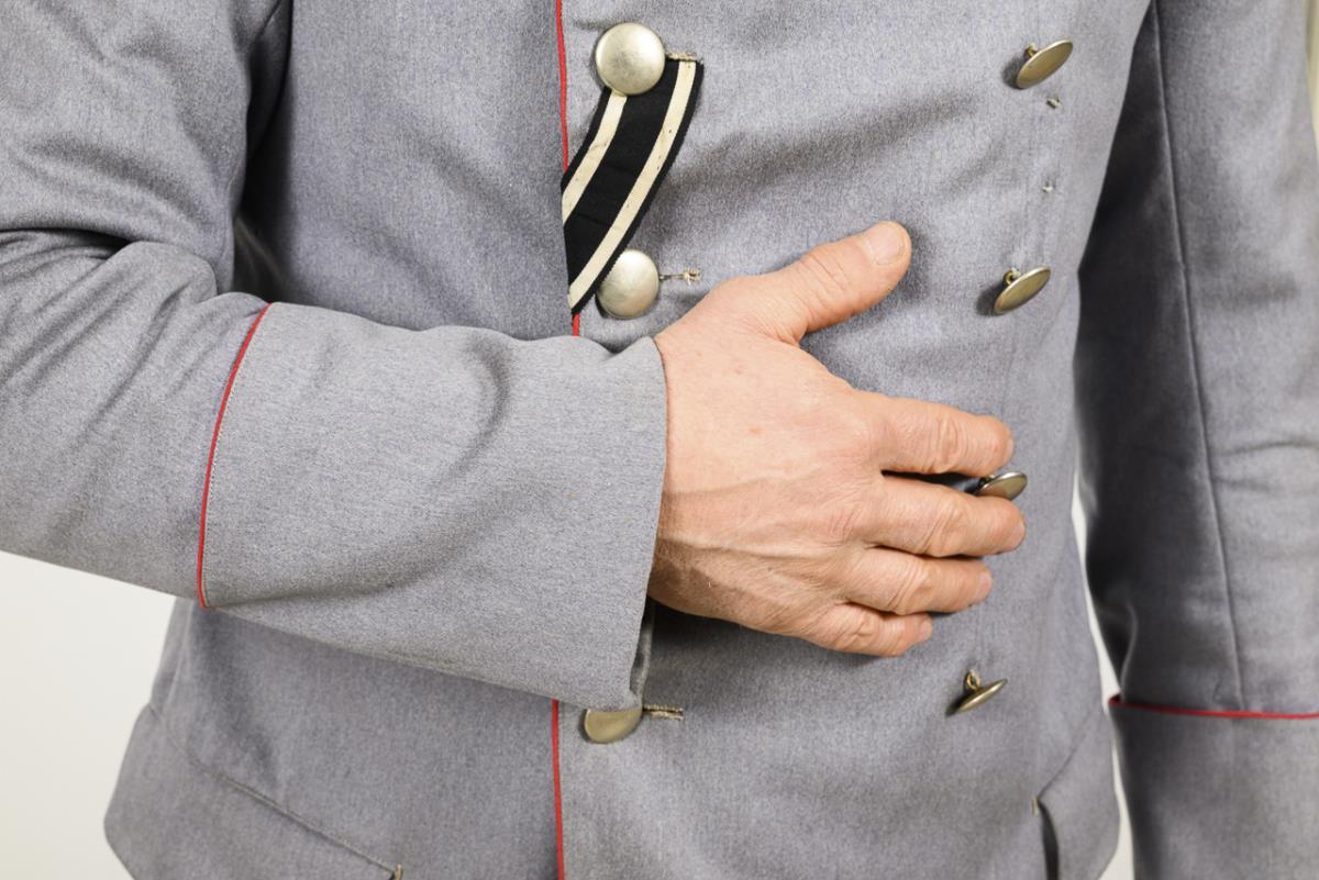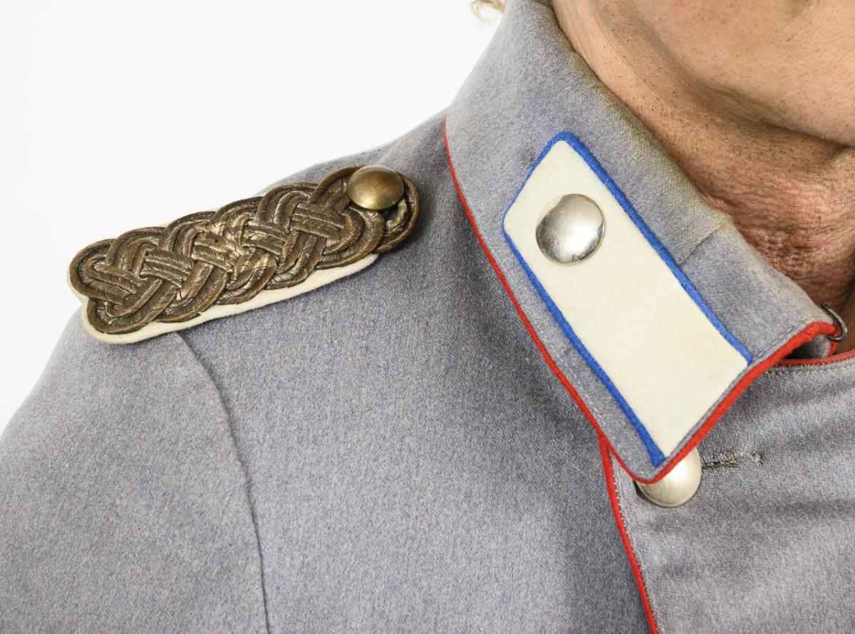 Grey high-quality cloth with red piping, single cuffs, double row of silver-coloured buttons, EK I ribbon. Turn-down collar with white mirrors and medium blue piping. Signs of wear and minimal moth damage.