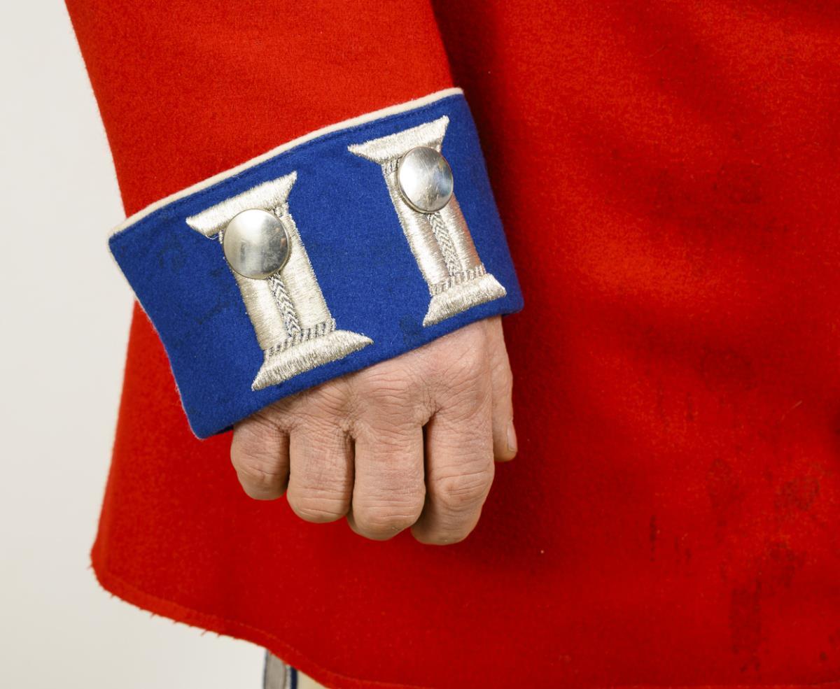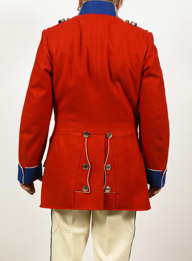 Disciple stitched tunic. Red with white piping and medium blue lapels, stand-up collar. Stained at the front. / With white trousers with silver side stripes and blue lapels.
