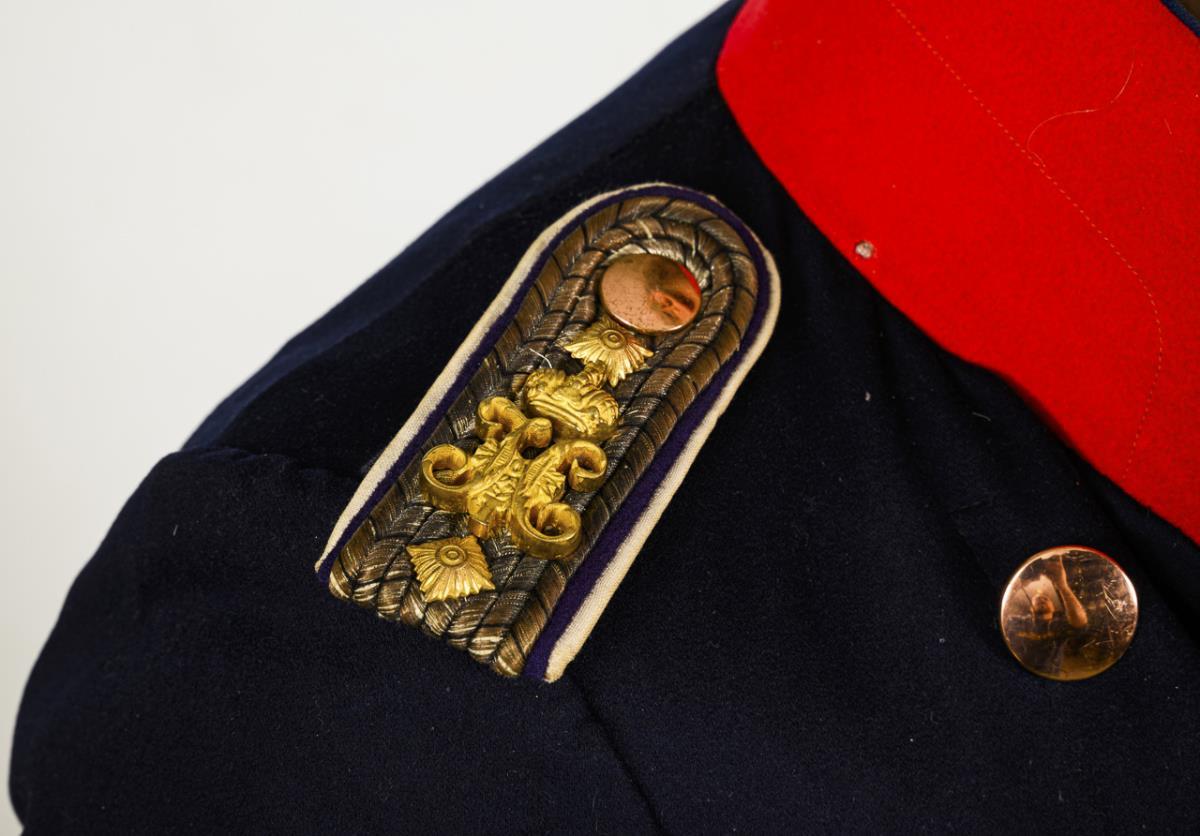 Professionally sewn, younger coat made of dark blue cloth with red piping, double row of copper-colored buttons and red stand-up collar. / Original epaulettes for a captain in the cuirassier regiment "Emperor Nicholas I of Russia". Tracks of wear.