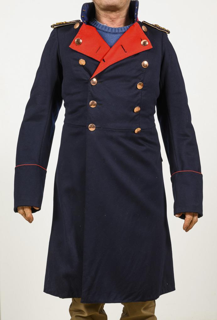 Professionally sewn, younger coat made of dark blue cloth with red piping, double row of copper-colored buttons and red stand-up collar. / Original epaulettes for a captain in the cuirassier regiment "Emperor Nicholas I of Russia". Tracks of wear.