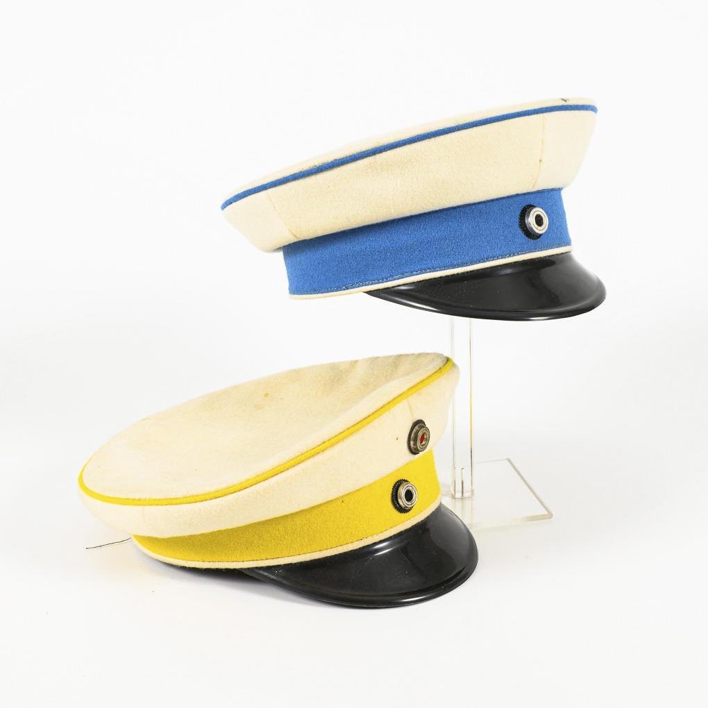 White plate caps with blue and yellow piping and stripes as well as Prussian and imperial cockade. Blue cap without imperial cockade.