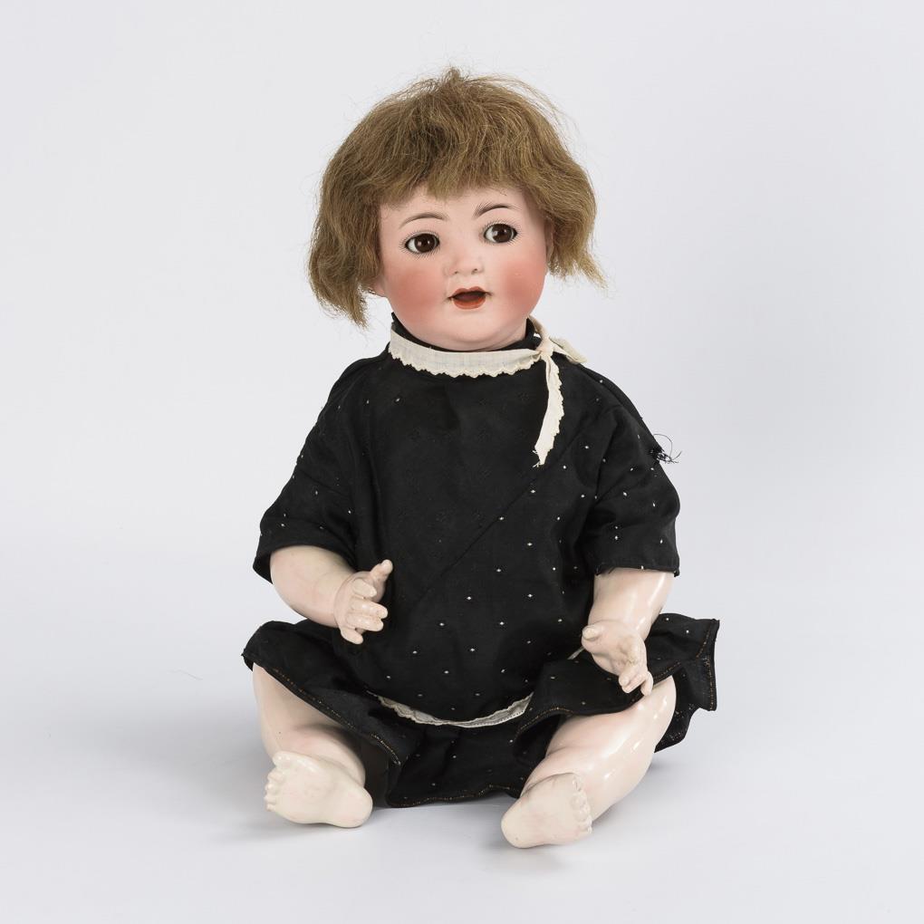 Cranked head, brown sleep/shelmet eyes, dark blond mohair wig. 5-part sitting baby body with voice. Black dress. Head x-rayed: without defects. Body probably repainted, 1 fingertip repaired.