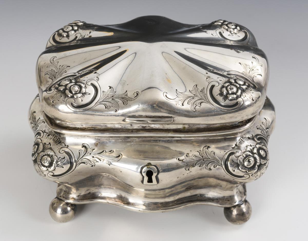 Bellied pressed form with flower reliefs and ball feet. With 8 engraved names for an inspection officer on the underside. With lock, without key. Small dents, traces of soldering.
