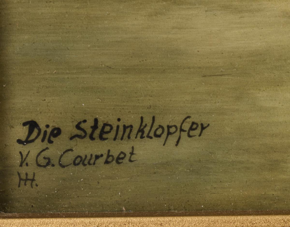 Rectangular panel depicting two men chipping stones in a landscape, after a painting by Gustave Courbet (1819-1877) from 1849 .