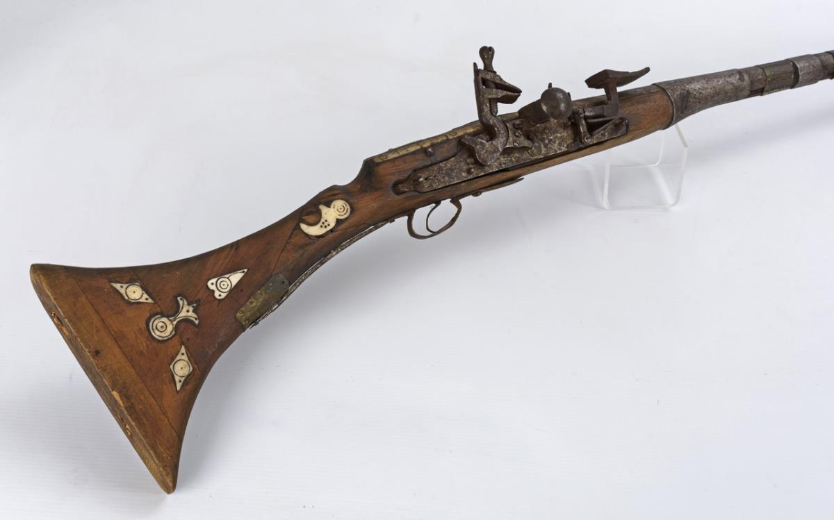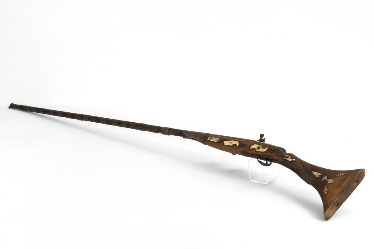 Very long barrel, tightly bound to the stock with chased brass bands. Butt stock with ornamental bone inlays. Ramrod does not come loose. Old repair marks. Signs of age and use, metal parts with corrosion marks.