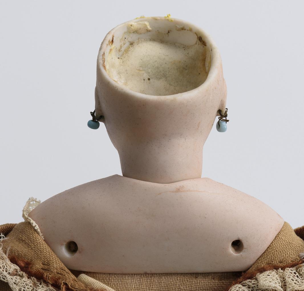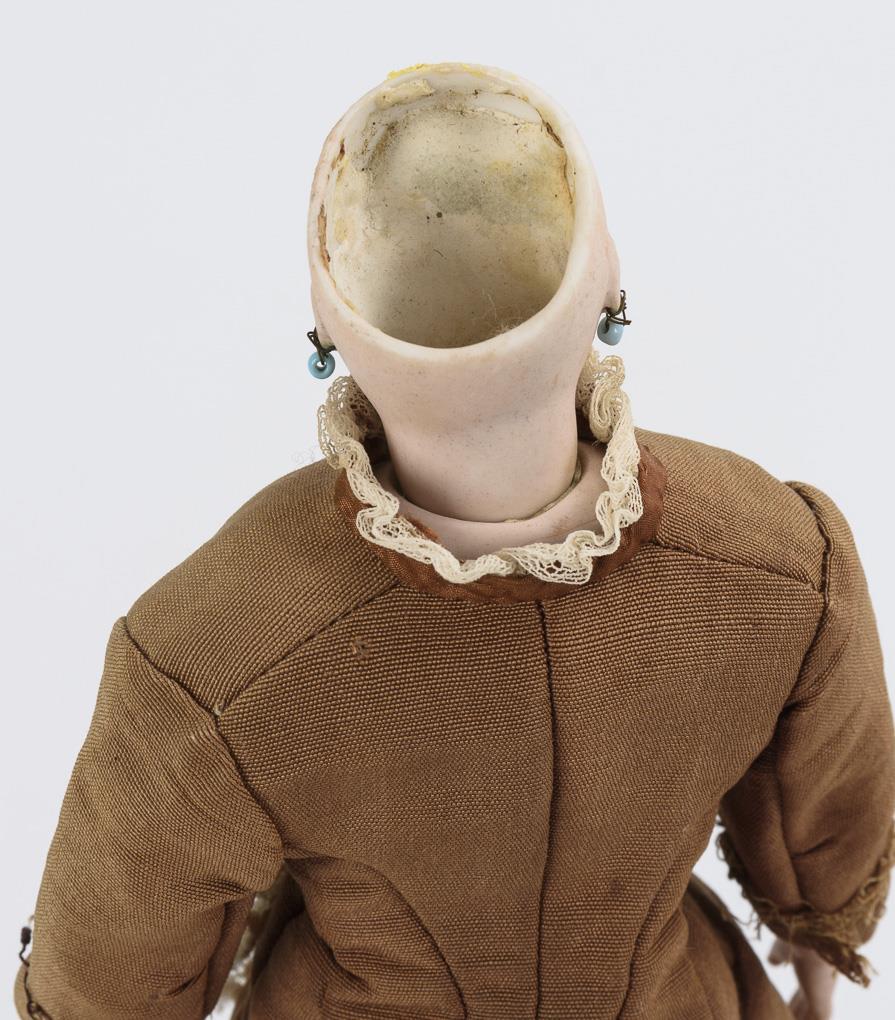 Cranked head on breastplate, fixed blue glass eyes, earrings, blond mohair wig. Slender fabric body with bisque arms. Brown costume, black shoes, fan and sewing kit. Head x-rayed: without defects.