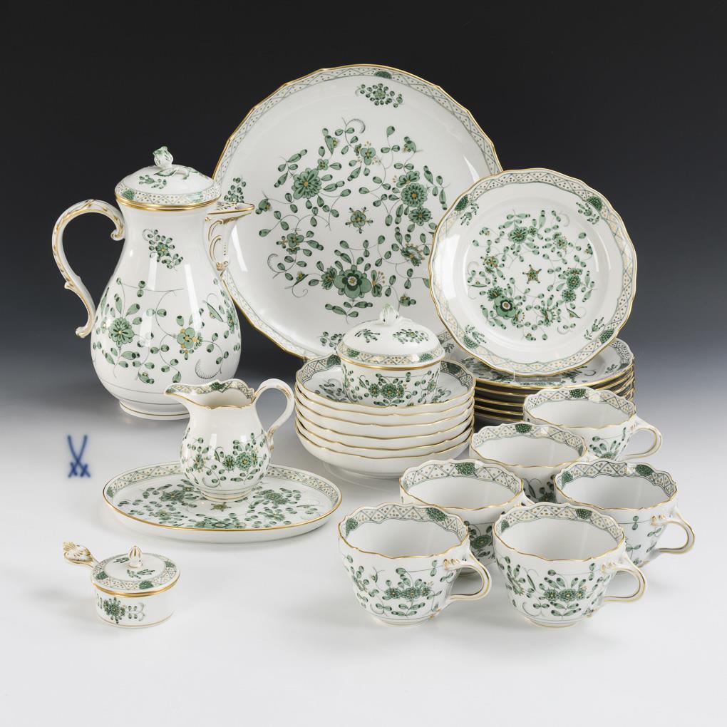 24 pieces. "New cut-out" shape. Coffee pot (H 23 cm), milk jug, sugar bowl, 6 coffee cups, 6 saucers, 6 cake plates, 1 oval tray (L 18 cm), 1 credenza plate (Ø 28 cm) and 1 pan for tea light (burner from a teapot). Bump on the sugar bowl knob.