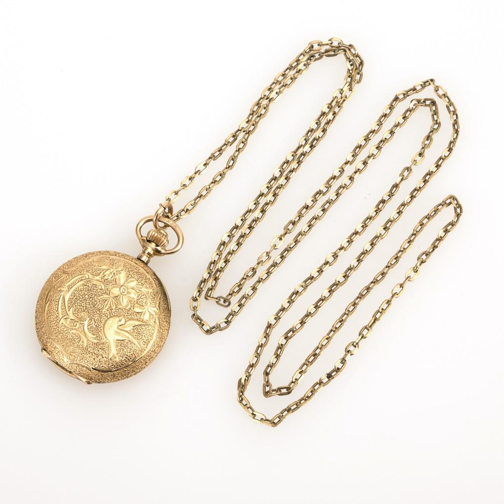 Finely chased spring lid case with bird motif on both sides on a flower branch, empty oval cartouche, "metal" dust cover. Comes with a doublé link chain. Dial with hairline crack, slight signs of age and wear.