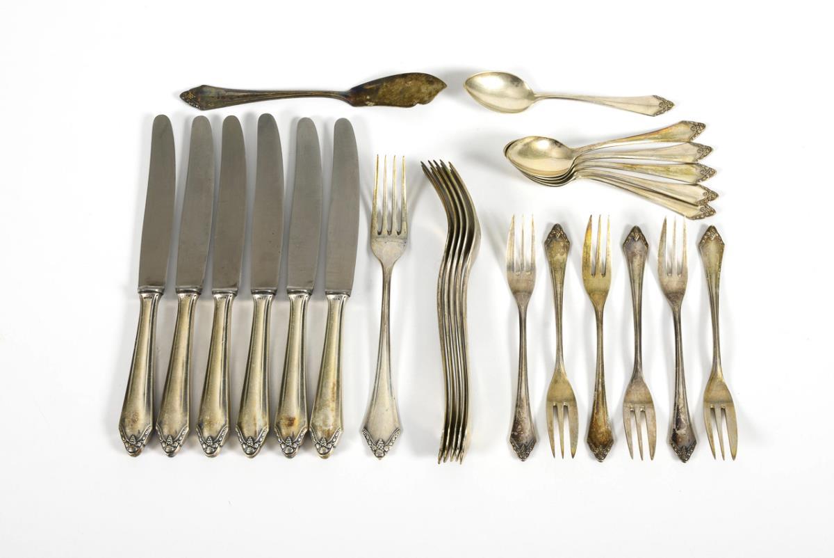 Art deco silver cutlery for 6 persons in 2 caskets. Hanseatische Silberwarenfabrik, Bremen.