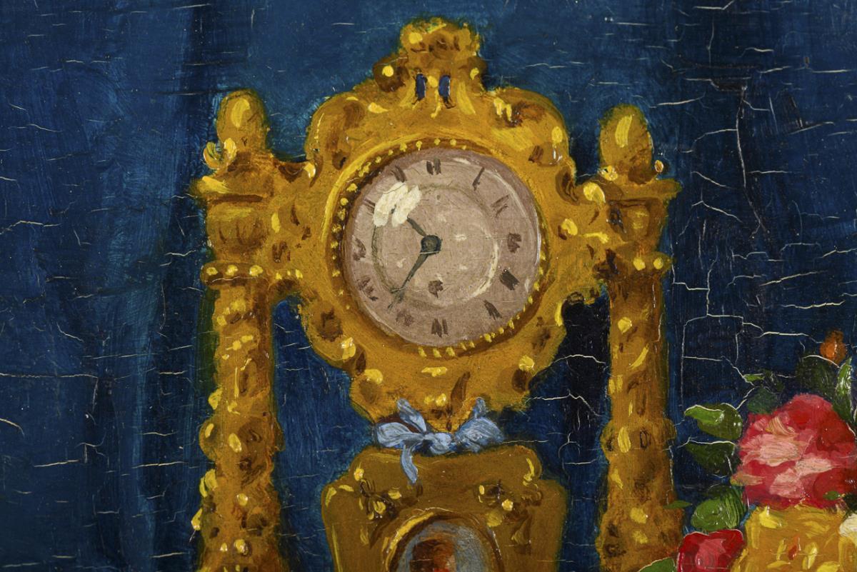 The magnificent, golden clock next to a bouquet of flowers and fruit plate on a table set in white next to a cup in front of a blue curtain. Slight traces of age.