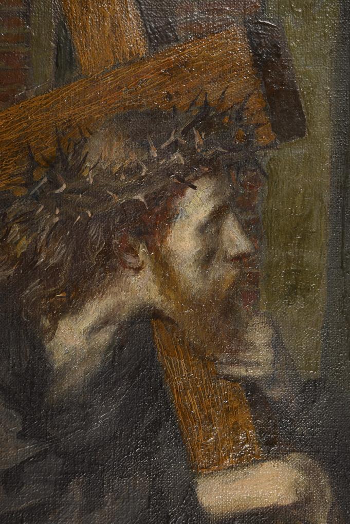 Christian scene with Christ carrying the cross as he passes a house with Mary praying.
