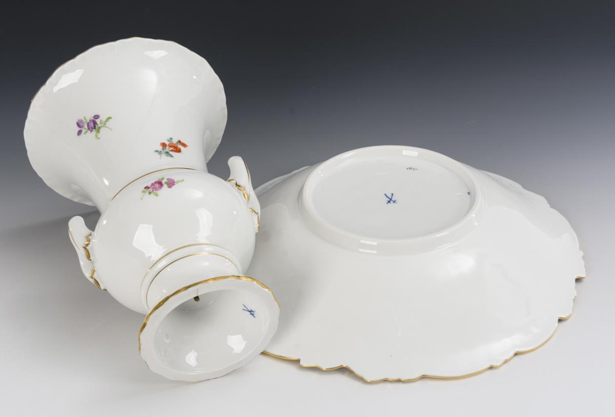 Prunk bowl and krater vase with flower painting. Meissen.