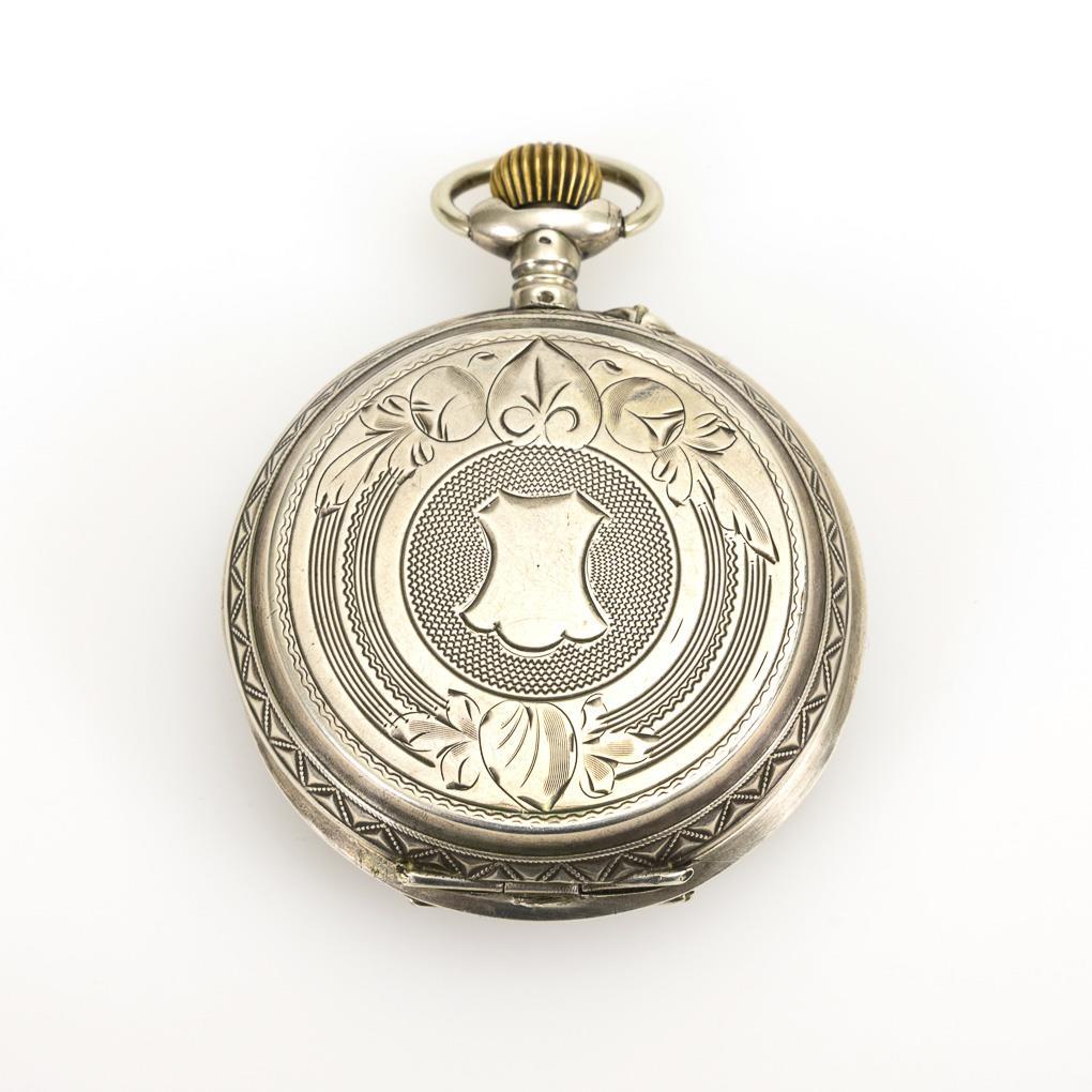 Florally and ornamentally chased and engraved savonnette with empty coat of arms reserve, silver dust cover. Slight signs of age and wear.