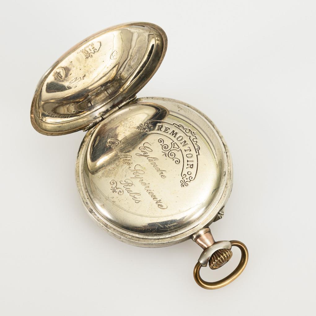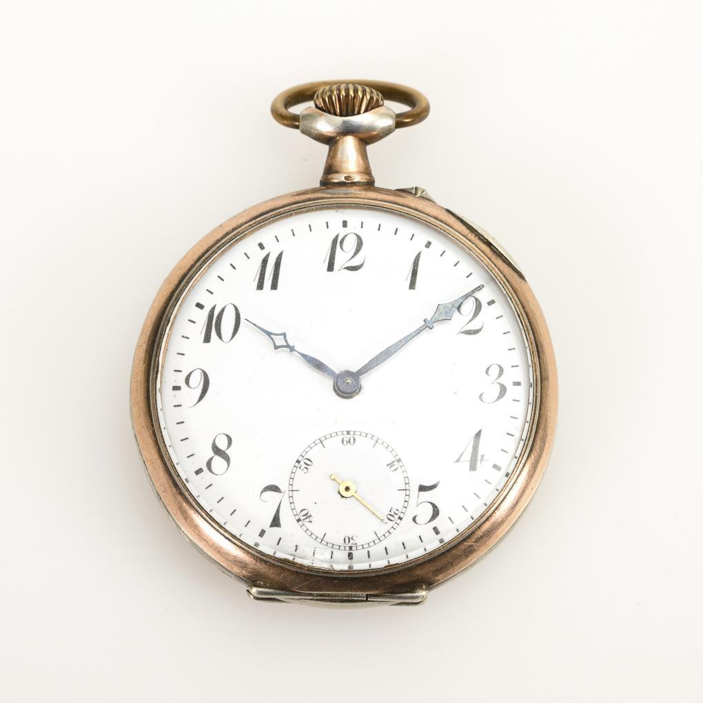 Movement with cylinder escapement, tire balance, jewels, crown winding. Functional in short-term test, in need of revision. White enamel dial with Arabic numerals, minute ring, small second and blued cathedral hands.