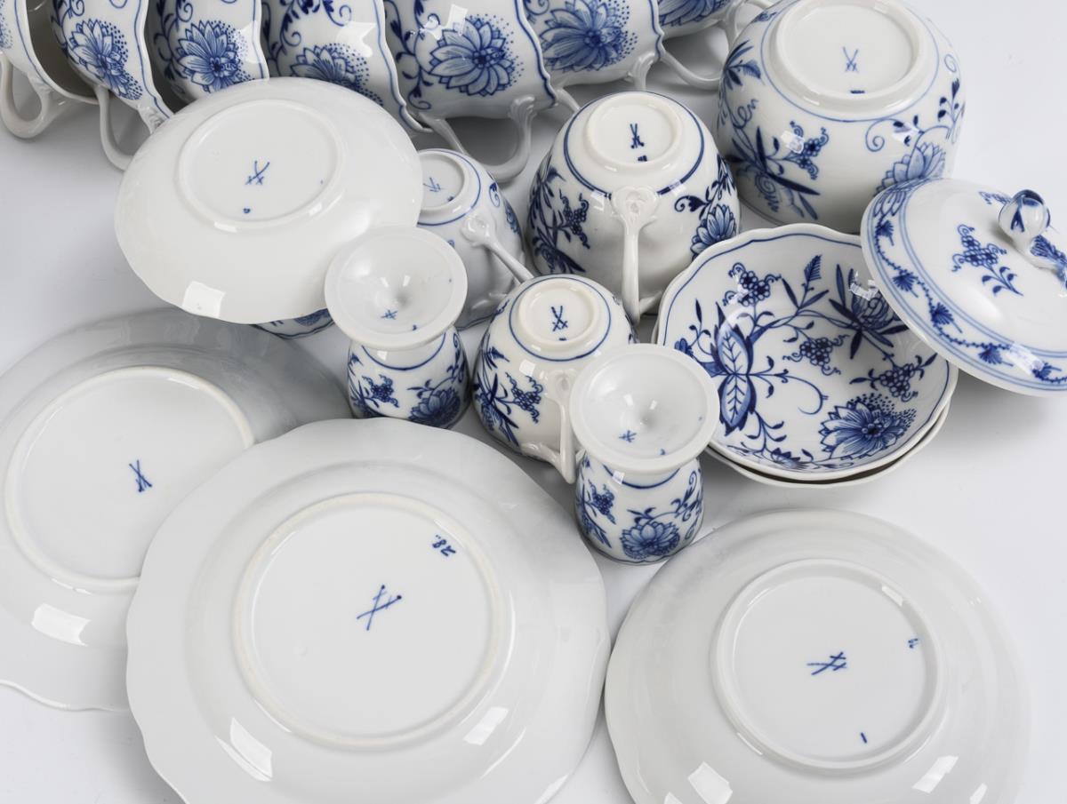 63 pieces. "New cut-out" shape. Coffee pot (H 23.5 cm), jug (H 16 cm), 2 milk jugs (H 11.5 and 13.5 cm), 1 sugar bowl, 14 coffee cups with 15 saucers, 14 breakfast plates, 2 demitasse cups with 2 saucers, 4 cake plates (Ø 16 cm) and 2 + 5 egg cups. Broken inner rim and chipped knob on jug lid, chipping to 1 saucer rim and 2 cup rims.