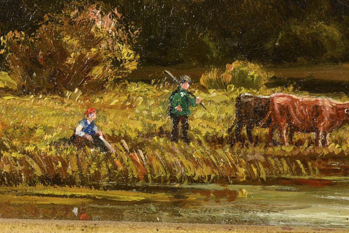 The animals on the riverbank near a small wood and a castle under a cloudy sky.