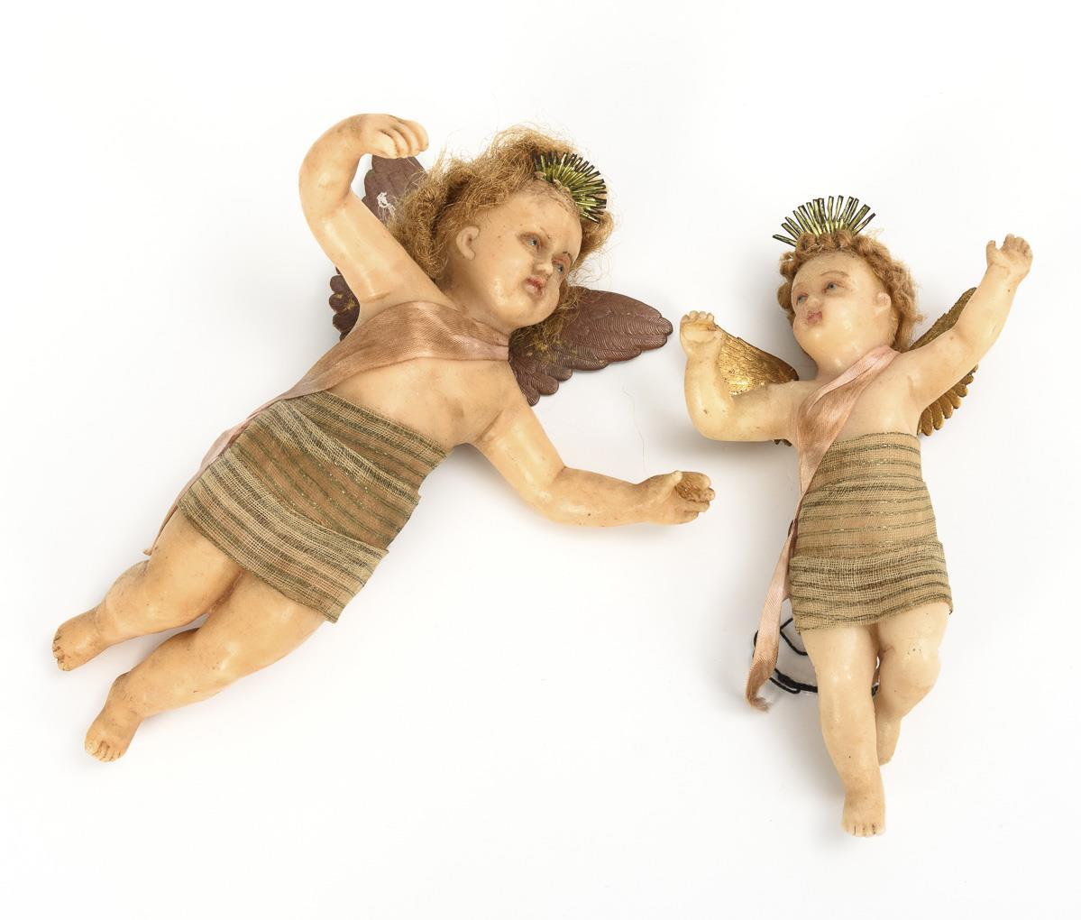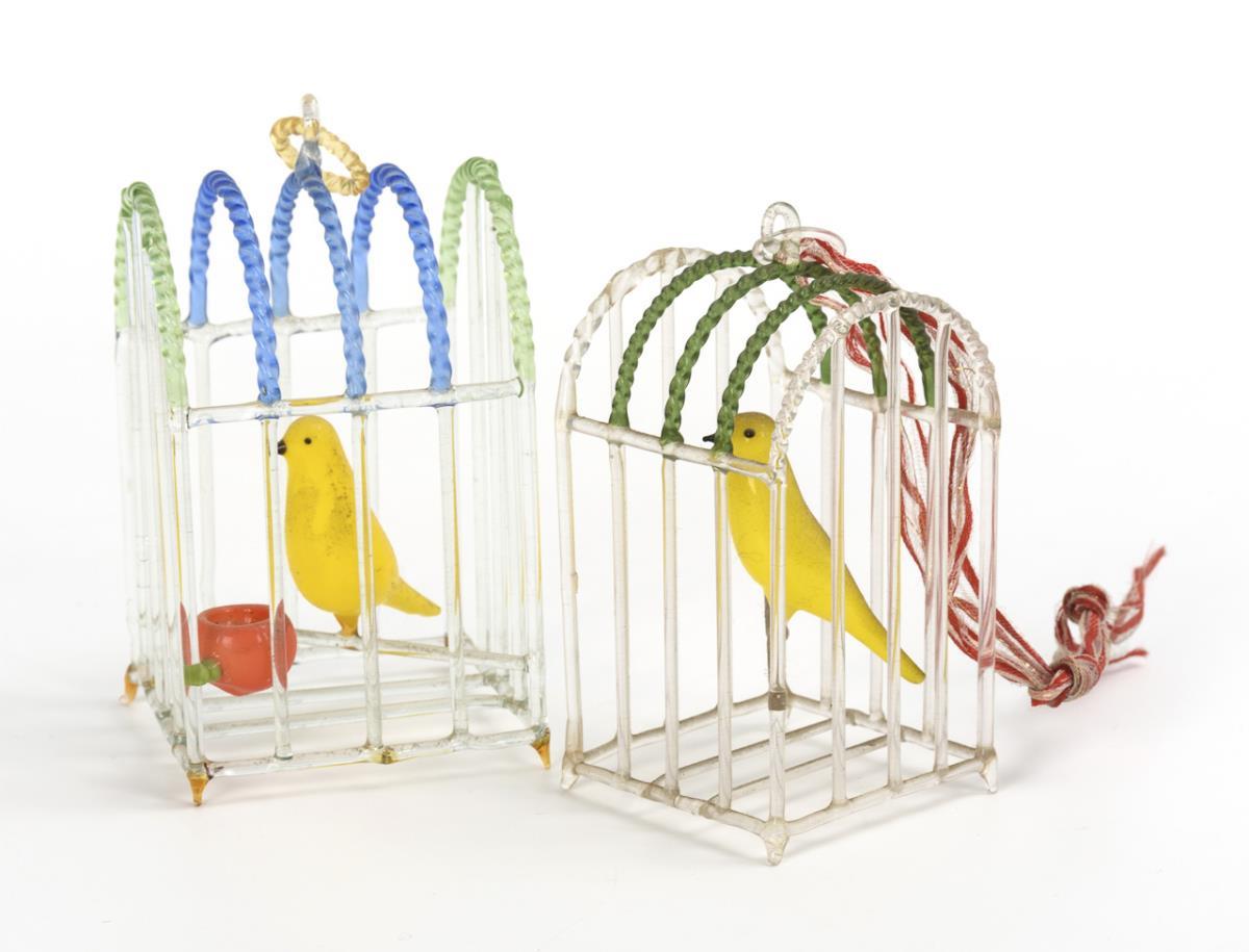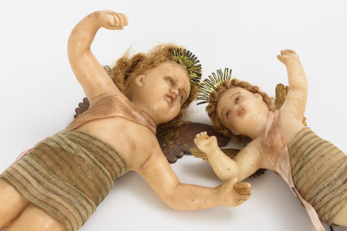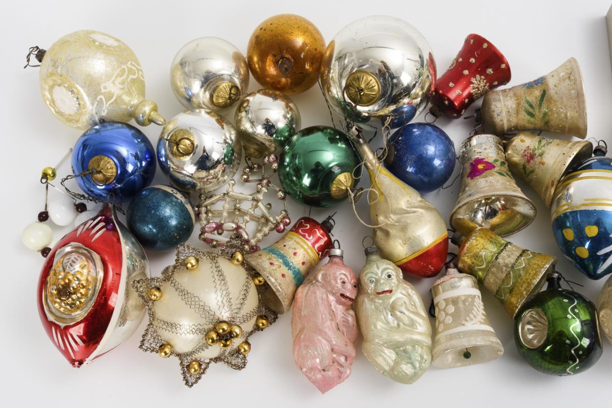 Approx. 25 pieces of old glass jewelry, 12 younger, small silver balls, 2 glass birdcages and 2 waxed angels (L 17 / 22 cm). Including several candlesticks. 1 finger missing from the smaller angel.
