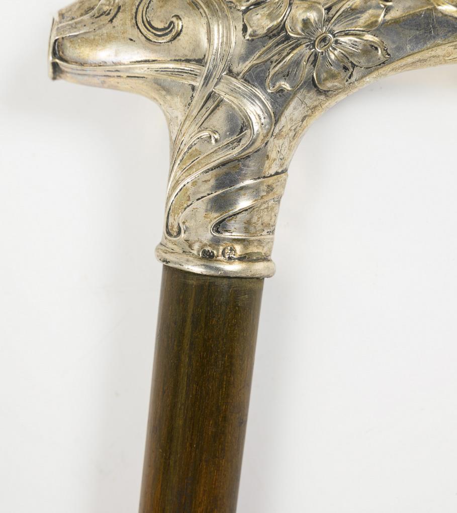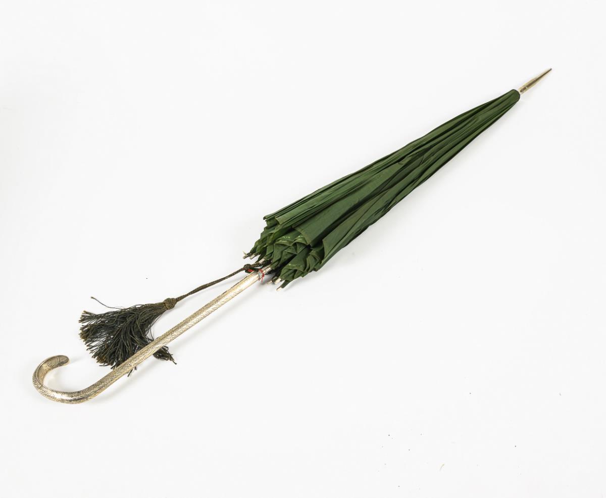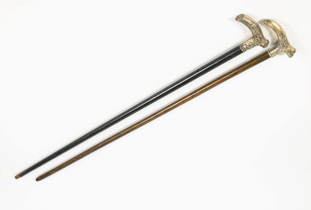 2 Fritz crutches with Art Nouveau relief and wooden weft (1x ebonized), 1x with iron ferrule. / Umbrella with engraved bow handle and green fabric cover ("Wonderful Nylon Extra") as well as cover and tassel. Some strong signs of age/use.