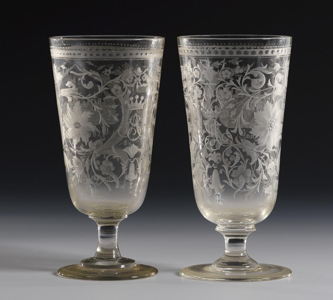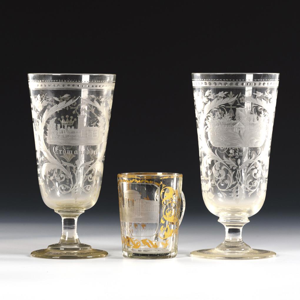 2 similar goblets with conical bowl, stem and round foot: engraved and inscribed depiction of Erdmannsdorf and Kynast on the front, vegetal tendrils and the crowned monogram "AS" on the reverse (h 17 cm). / 1x small, faceted mug with an inscribed depiction of Franzensbrunn on the front, surrounded by gold-painted tendrils (h 8 cm).
